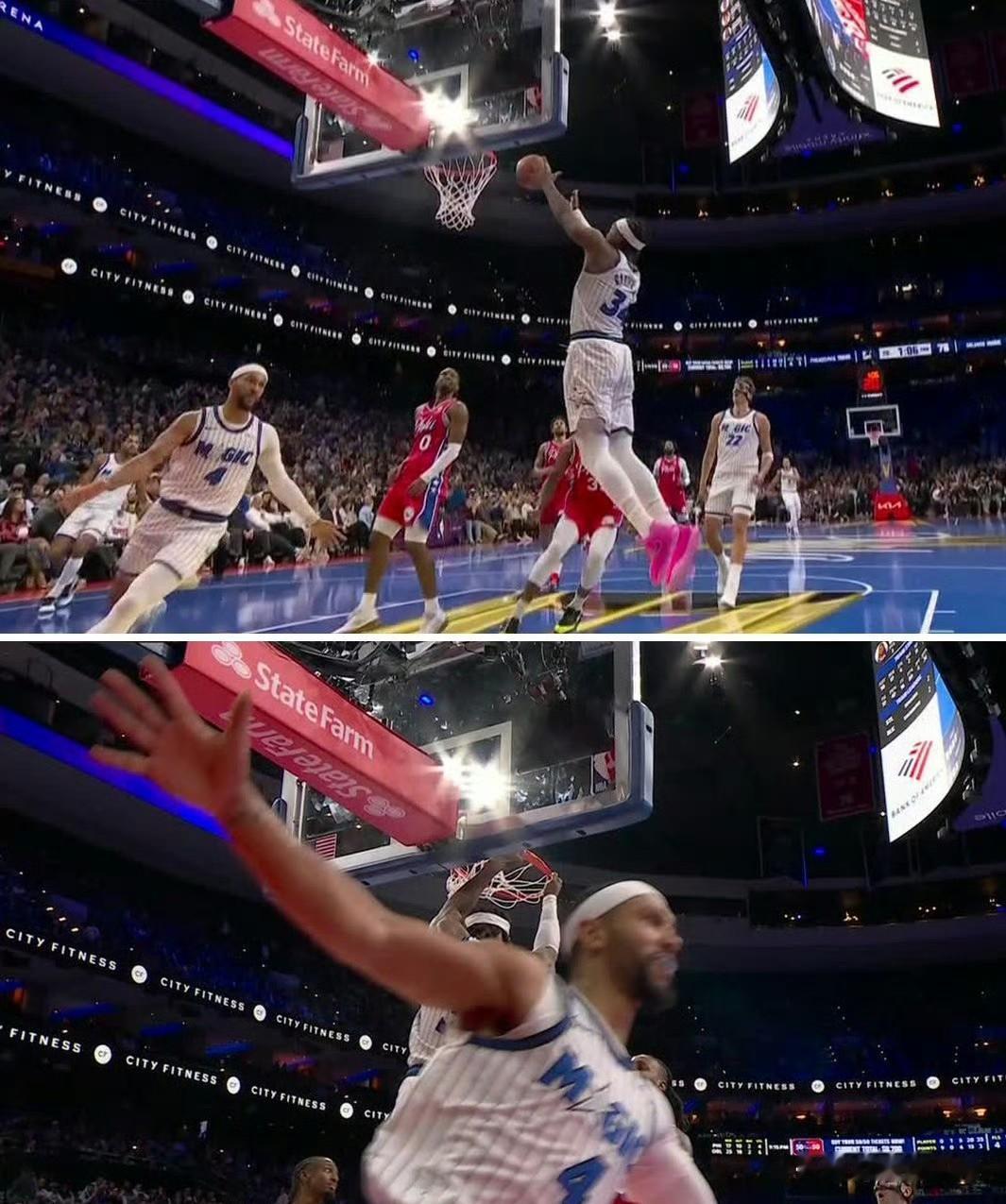 经典!萨格斯+小卡特复制“詹韦连线”! 今天魔术大胜76人的比赛中,萨格斯在一个快攻回合送出助攻,小卡特心领神会上演空接暴扣。萨格斯随后做出了经典庆祝动作致敬韦德,这一幕引发热议。 本场比赛,魔术队共计9人得分上双,替补席有多达5人得分上双,三节以60%的命中率狂轰121分,全场得到144分,进攻火力非常凶猛。其中萨格斯和小卡特致敬经典的配合让人印象深刻。