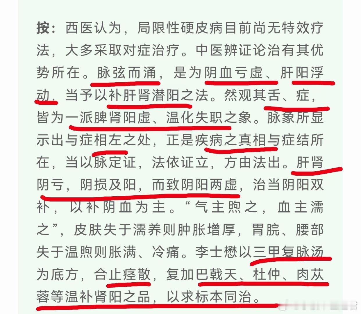 李士懋国医大师这个医案精彩疑难大病的纳差、胃胀,有那么简单吗?是健脾和胃,消积化食,祛湿能解决的吗?很多老年人或者慢性疑难病患者经常说,医生,我也不求你能治好我的病,但求胃口好,吃得下,拉得出,睡得香,有力气,精神好!我的老天爷,你这还“但求”,你觉得吃喝拉撒睡都好,很容易是吗?如果这些都好,得啥大病你都不怯,都会走向光明我们看李大师这个医案,一般人看到胃口不好,消化慢,不能吃凉的,肯定就从脾胃治了,疗效可想而知不会好的。李老用的是三甲复脉汤打底,再加温润柔养肾阳之品,阴阳同求,结果不仅胃好了,原发的自身免疫性疾病也控制满意我最近陶醉于国医大师周仲瑛老先生的著作之中,从他的字里行间能感受到这是一位真正的学者,质朴低调,痴迷于临床,倒不是说他治所有病都是一诊起效,而是疑难大病,他有办法,条分缕析、步步为营,最终取效,他交代弟子治疗疑难杂病一句话——“慢慢磨”!是骡子是马,拉出来遛遛,只有临床能体现出医生真正的理论功底、思维能力、辨证水平和用药技术。病人给机会,咱就投桃报李,受人之托、忠人之事;病人少,咱就认真看书,不断通过读书、读医案来进行临床描摹和演练。可以不出名,可以不赚钱,但绝不要吹牛,绝不要忽悠,绝不要自欺欺人!