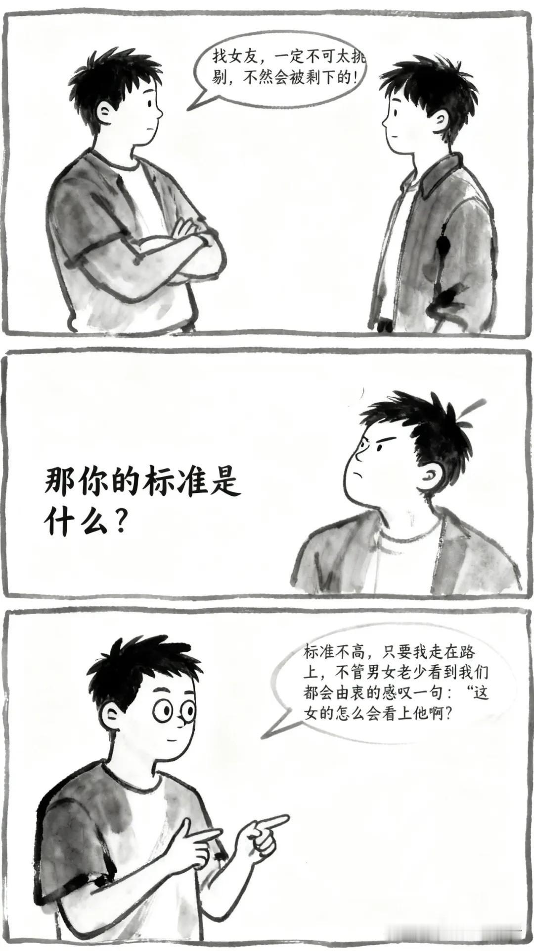 趣味漫画:朋友对我说:“找女友,一定不可太挑剔,不然会被剩下的!”我问:“那你的标准是什么?”