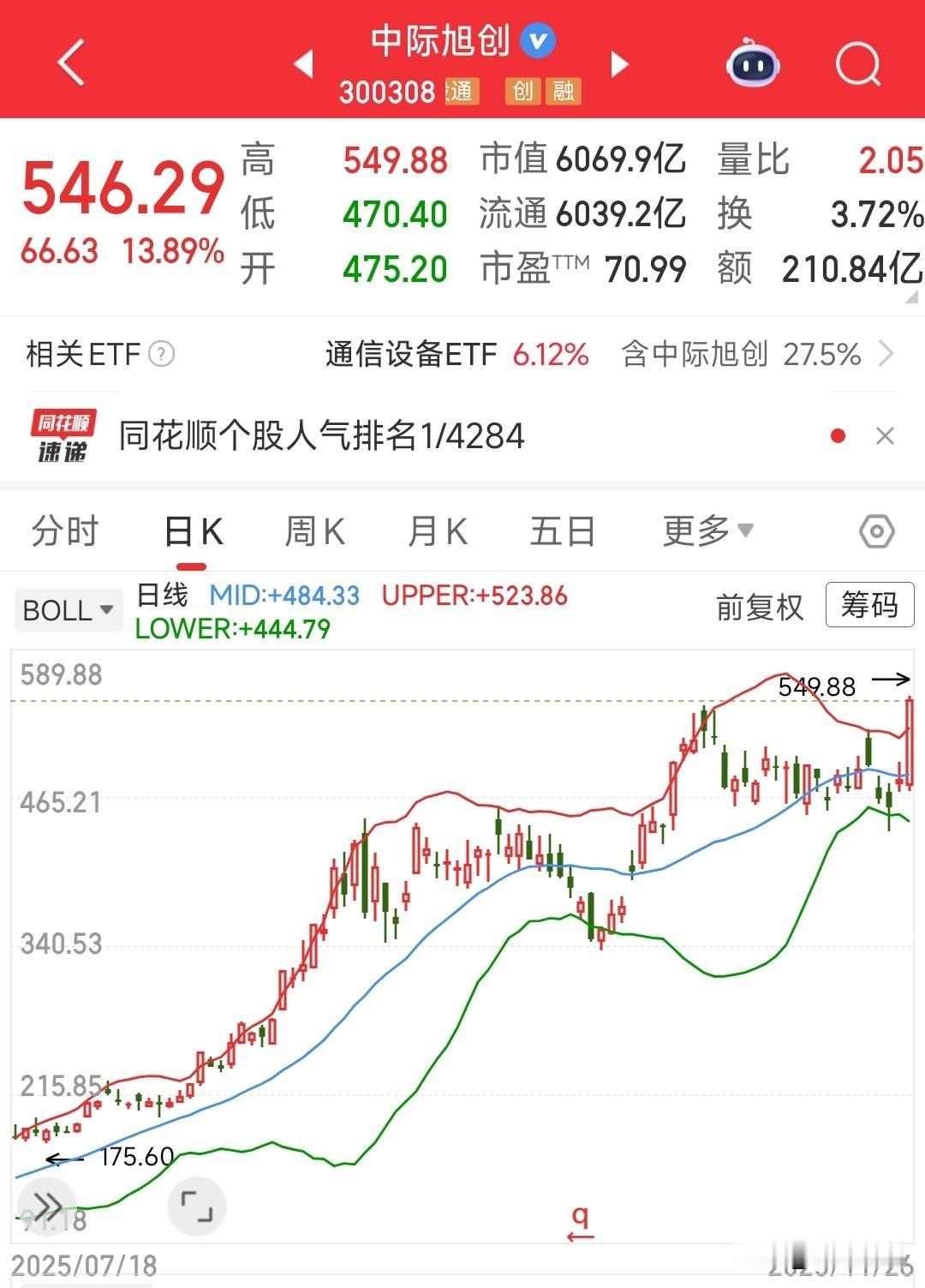 今年最牛的牛股今天居然出现了这个数字,希望不是到头了 要说今年最牛的股票非中际旭创无疑,从启动到现在的股价足足涨了6倍,关键是这个股票是机构催生涨起来的,并不是炒作消息面,是人工智能的排头拉升,虽然吃到了热点的红利,但是更多的是机构对其业绩的一种认可。 不过今天最高股价来到了549.88元,遇到88这个数字谁都会打鼓,如果过不去那将是股价的最高点,意味着下跌的开始。 今天涨了13%以上,主要是昨天出了政策性利好消息,能不能挺住就看明天的走势,现在确实风险还是挺大的。