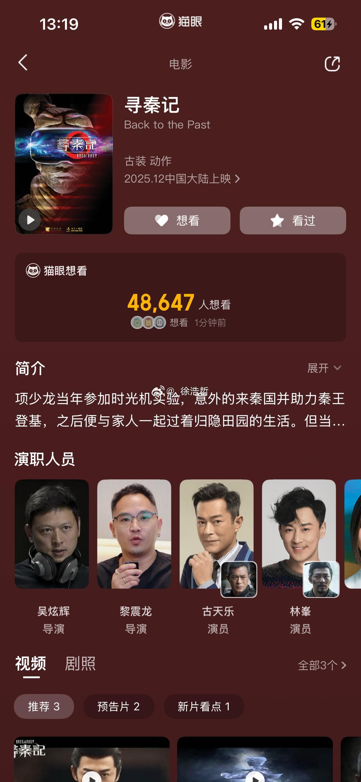 电影《寻秦记》港版定档海报发布 大陆官抖开通猫眼app显示将于2025.12中国大陆上映并出现在待映推荐位 即将定档演员阵容方面古天乐总监制,洪金宝动作导演,古天乐、林峯领衔主演 三番为新增中国大陆(青岛)演员 白百何佳片奇遇季电影版寻秦记