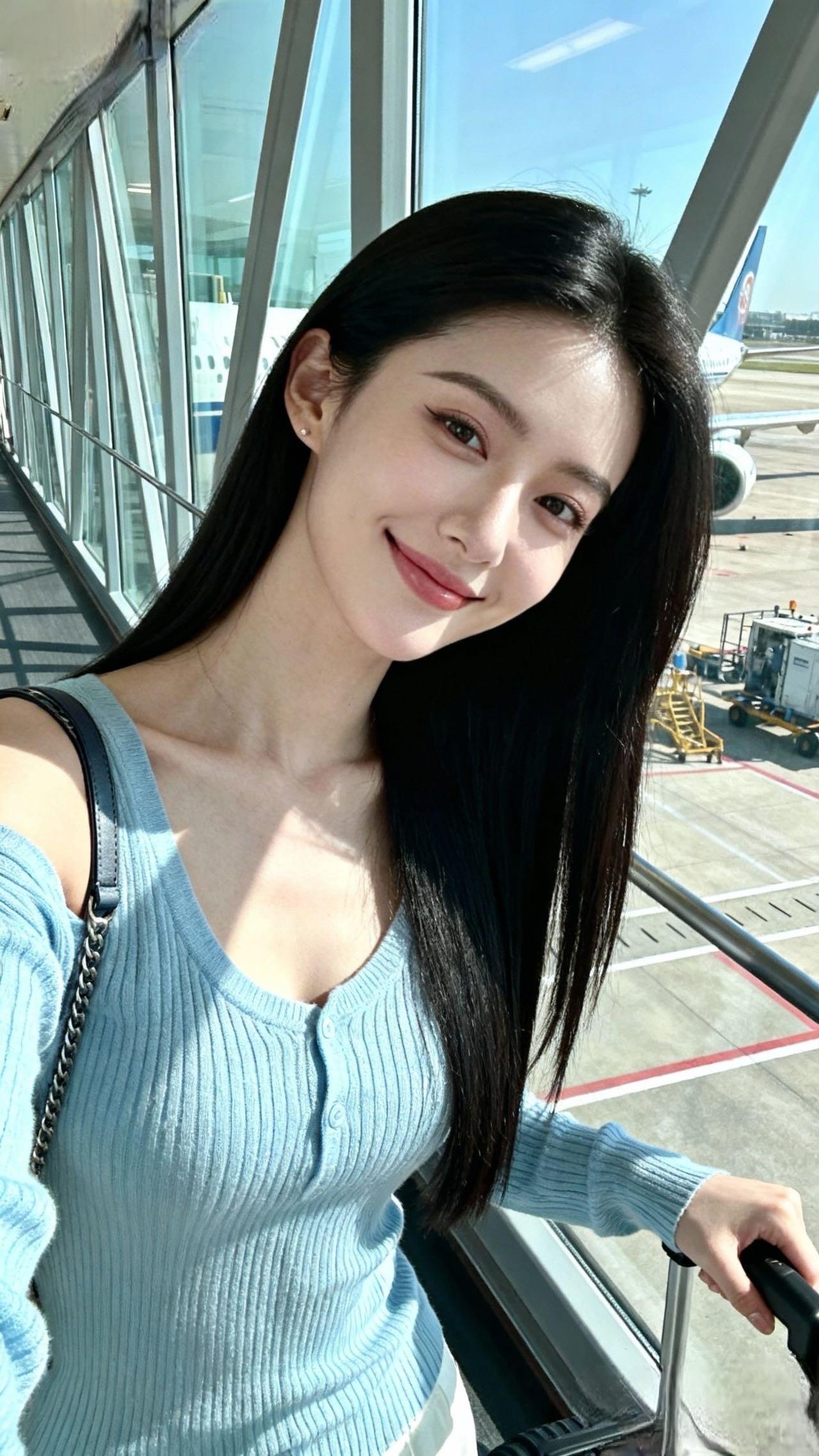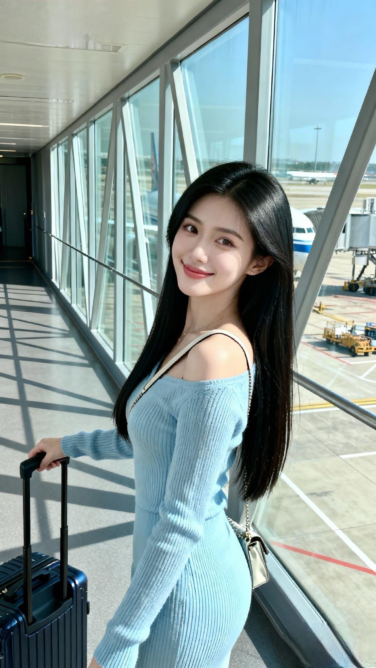 今天在登机廊桥被阳光“追着跑”啦✨ 浅蓝露肩针织裙刚好接住初夏的温度,贴肤的针织纹软乎乎的,露肩设计又偷偷藏了点小小心机~ 拖着行李箱靠在窗边,刚好撞见停机坪上的飞机在反光,风裹着机场特有的气息吹过来,连头发丝都在晃悠着开心🥰 这种“下一秒就会飞去哪里”的松弛感,大概就是旅行最迷人的预告吧~高清美女 美女人像群 高雅气质美女 美女欣赏图片