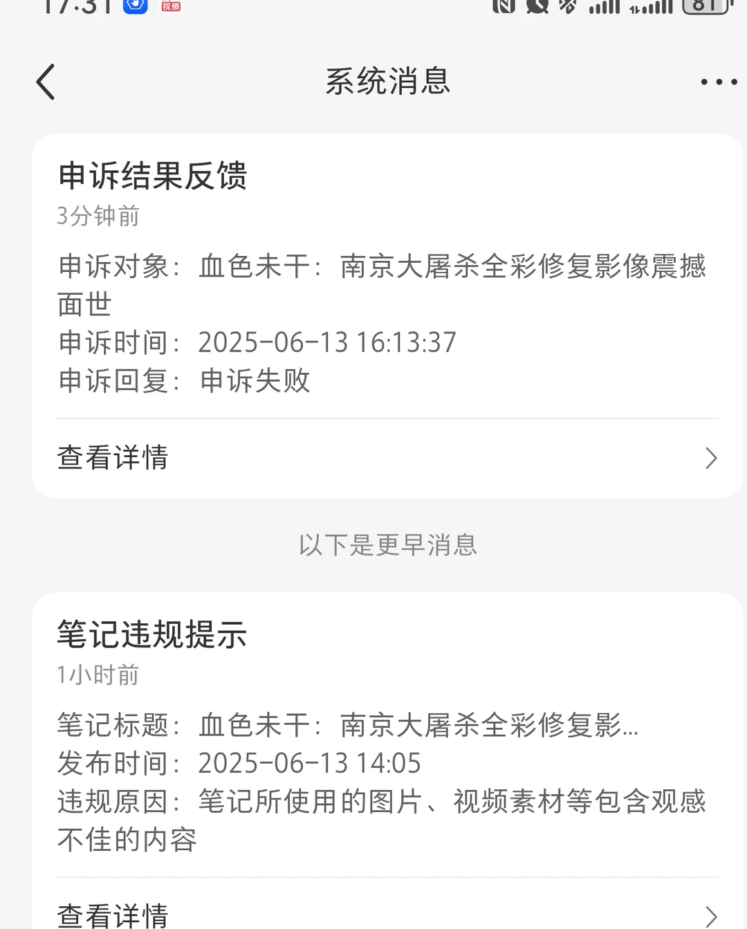 南京大屠杀修复影像被判违规了,我已经在这边尽力申诉了,脚盆鸡审核不同意。其他平台我们同名账号均可看