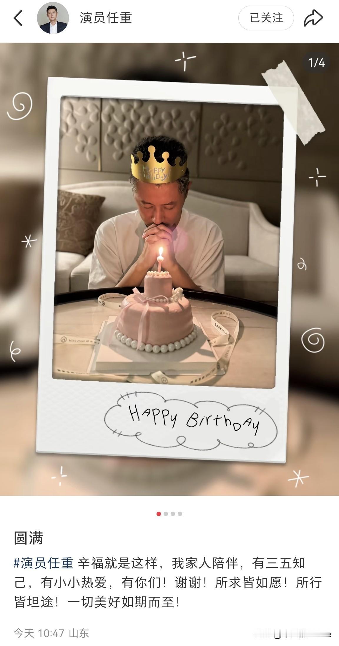 11月26日,演员任重罕见在社交平台发文说道:“圆满!幸福就是这样,我家人陪伴,有三五知己,有小小热爱,有你们,谢谢。所求皆如愿,所行皆坦途,一切美好如期而至。” 任重发了4张照片,一张照片是个人生日照,另外3张是剧照,涉及的影视剧包括《把黑夜点燃》《多喜一家人》和《昨夜将至》。 任重在今天刚好满46岁,祝他生日快乐。 照片中的他头发花白,上身穿着白色短袖,头上戴着“皇冠”,粉色的蛋糕上点了一根蜡烛,他闭着眼睛在许愿。 任重和妻子孙骁骁结婚后,两人养育了一个女儿,生活过得倒是特别幸福,两人结婚以来都很低调。 在任重生日之际,孙骁骁给老公任重订了一个粉色蛋糕,只可惜她并没有出镜。 孙骁骁比任重小6岁,毫不相干的两个人居然低调结婚了。孙骁骁曾与李响有过一段轰轰烈烈的爱情,只可惜后来没走到一起。 孙骁骁也曾是湖南卫视主持人之一,她主持过很多节目,蛮有才的,我觉得恋情耽误了她,大家觉得呢?
