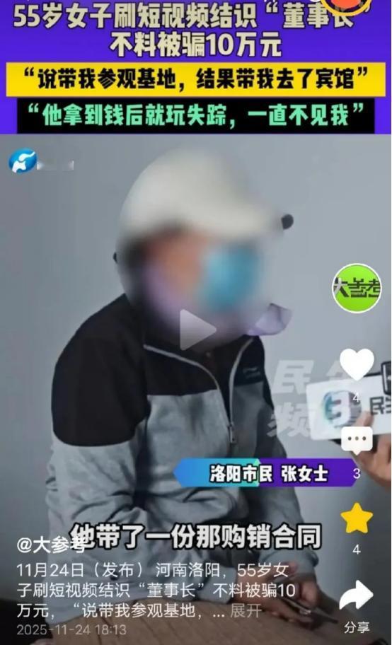 近日,河南洛阳,55岁女子被男子骗到宾馆开房,对女子说我喜欢你,女子信以为真,给他转520红包,还拿300现金给他买短袖。之后男子又以“项目周转”为由,跟女子拿了10万1千元。没想到,钱一到账,男子就彻底失联。女子这才意识到被骗,哭着向媒体求助:他说他是公司董事长,穿的都是名牌,说的话那么真诚,我完全信了。 55岁的张女士(还行)一名自称是董事长的男子网恋后奔现,没想到却被骗的体无完肤...... 张女士第一次意识到不对劲,是在给对方转完十万之后。那天她按照约定,分两笔把自己攒了大半辈子的养老钱,转到了骗子指定的账户上,还特意发微信叮嘱他“注意安全,好好打理项目”。 可消息发出去后,却像石沉大海一样没了回音。她以为对方只是忙,又连着发了几条消息,结果还是没动静。直到她试着打电话显示对方关机,张女士才慌了神。 她赶紧打开微信,想看看对方的朋友圈有没有更新,却发现之前满屏的“董事长日常”,包括西装革履考察车间、和客户谈生意的照片、公司基地的视频,全都不见了。 张女士终于意识到,自己可能被骗了。而此时,距离她和对方确定恋爱关系,已经过去快半年了。 从今年5月份开始,对方曾用各种理由让张女士为自己买单。包括开房、吃饭、买衣服, 张女士当时心里犯过嘀咕:一个“董事长”,怎么会连开房钱都没带?可对方始终表现的淡定坦然,又对张女士体贴入微,这才一次又一次得手。 后来,张女士才幡然醒悟,那些所谓的“关心”,不过是骗子的手段。目前,警方已经接手了案子,可对方当初提供的身份信息很可能是假的,想要追回钱并不容易。 可怜张女士清清白白一辈子,到头来,竟落得个晚节不保、人财两空的下场。这起案件也给很多中老年人提了个醒:网上认识的人,哪怕说得再好听、看起来再靠谱,涉及到钱的时候一定要多留个心眼。 不管是网恋、还是推销保健品、甚至是传销,一开始都是利用了老年人防范意识弱,容易轻信他人的弱点。 当一个人沉浸在情感幻想中时,理智往往会退居二线。那些在旁人看来显而易见的破绽,在当事人眼中却可以被轻易合理化。 我们作儿女的,也应该多陪陪父母。情感世界充实了,自然就不会去轻易相信陌生人的“关心”。对此你有什么看法?欢迎在评论区留言讨论。网恋 奔现骗局 信息来源: 民生频道|大参考2025-11-24报道 文|墨海 编辑|史叔