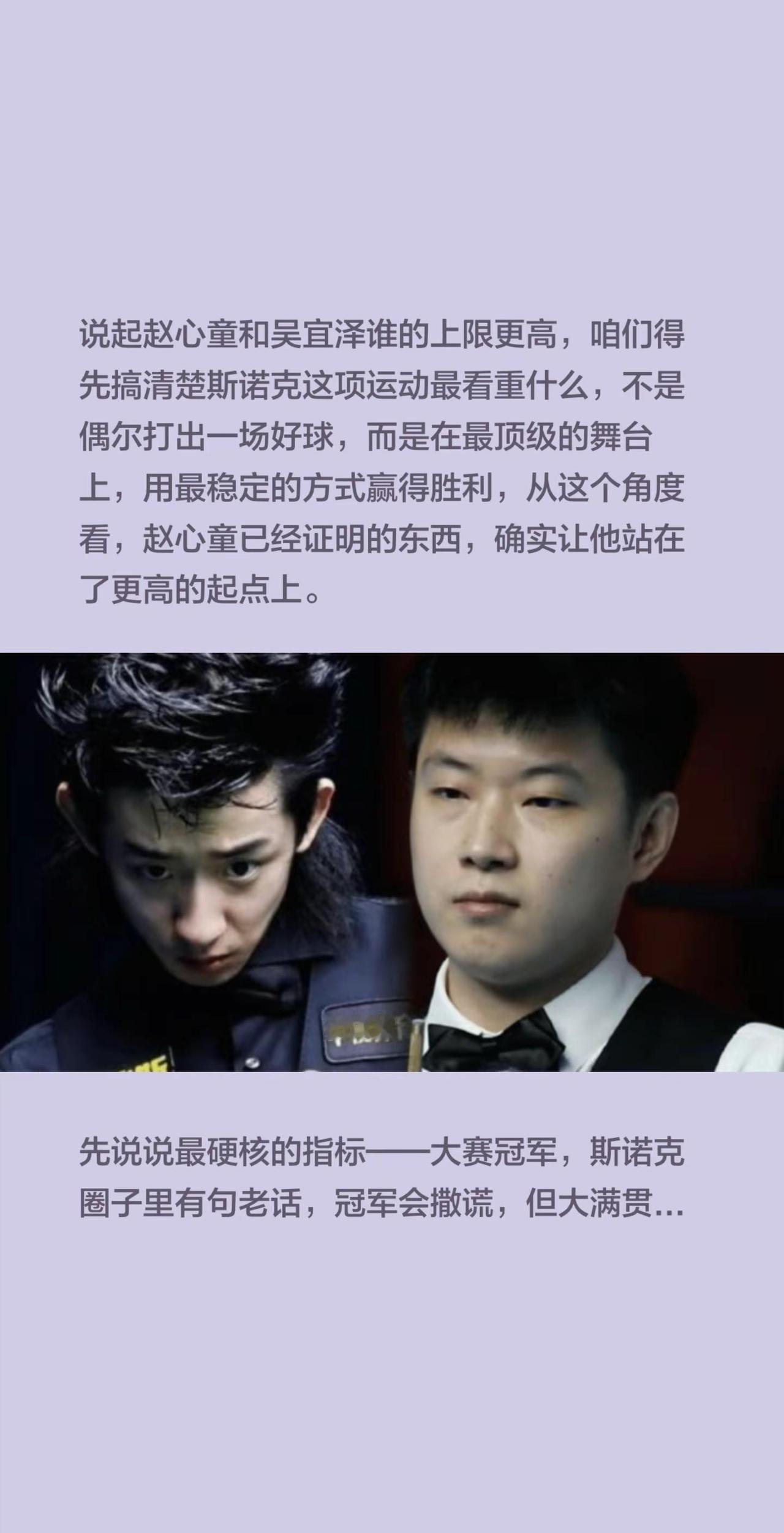 说句真心话,赵心童的上限要远高于吴宜泽。说起赵心童和吴宜泽谁的上限更高,咱们得先搞清楚斯诺克这项运动最看重什么,不是偶尔打出一场好球,而是在最顶级的舞台上,用最稳定的方式赢得胜利,从这个角度看,赵心童已经证明的东西,确实让他站在了更高的起点上。先说说最硬核的指标——大赛冠军,斯诺克圈子里有句老话,冠军会撒谎,但大满贯冠军不会,赵心童手里握着世锦赛冠军,这是斯诺克的最高荣誉,要知道,世锦赛那种长局制比赛,考验的不光是技术,更是体力、脑力和意志力的全面对抗,能拿下这个冠军,说明他已经在最严苛的环境下证明了自己的整套技术体系是经得起考验的,吴宜泽刚拿的国锦赛冠军确实漂亮,但要从排名赛冠军成长为三大赛冠军,中间还有很长的路要走。咱们再来聊聊两个人的技术特点,赵心童的长台准度在现役选手里都是排得上号的,这种与生俱来的准度天赋,说实话,后期很难练出来,他平均出杆14秒,这不是随便哪个球员都敢用的速度,快节奏下还能保持高精度,这本身就是一种稀缺能力,你可能说他的走位不够细腻,防守有时会掉链子,但职业教练们常讲一个道理:防守可以靠经验和系统训练来提升,但那种与生俱来的进攻手感,是教不出来的。吴宜泽的技术确实更均衡,他的母球控制很到位,防守成功率从78%提到86%就是最好的证明,这种全面型的打法确实更适合长期发展,但问题在于,全面型球员要达到顶尖水平需要的时间更长,他需要把各个环节都打磨到极致,这比专精一项要难得多。说到年龄,22岁的吴宜泽确实比28岁的赵心童年轻6岁,但很多人可能不知道,斯诺克选手的黄金年龄通常在25到35岁之间,这个阶段,球员既有足够的比赛经验,身体机能又保持在巅峰状态,赵心童正好处于这个窗口期的开始阶段,而且已经拿到了最重要的冠军,吴宜泽还处在成长期,未来能发展到什么高度,现在下结论还为时过早。从职业发展的规律来看,进攻型球员一旦补上防守短板,进步会特别明显,特鲁姆普就是个很好的例子,早期他也是靠准度打天下,后来把防守练上来后,直接就成了赛季六冠的霸主,赵心童现在就走在这条路上,只要他把防守稳定性提升到平均水准以上,他的进攻优势就会被放大。现代斯诺克确实越来越强调攻守平衡,但比赛的胜负手往往还是看进攻,特别是在关键局、关键球上,敢于并且能够打进难度球的能力,这才是决定比赛走向的最重要因素,赵心童在这方面已经多次证明过自己。吴宜泽的进步速度确实令人印象深刻,从排名24冲到12只用了10天,但职业体育有个规律:突破速度和最终高度不一定成正比,有些球员一飞冲天,有些则稳步上升,现在说吴宜泽一定能超越赵心童,证据还不够充分。说到底,评价一个球员的上限,要看他已经达到的最高高度,而不是可能达到的高度,赵心童已经站上过斯诺克的最高领奖台,这是实实在在的成就,吴宜泽的未来很光明,但他还需要在更多大赛中证明自己。从斯诺克的历史来看,那些真正改变过比赛的天才球员,往往都具备赵心童这种与生俱来的进攻天赋,这种天赋不是靠苦练就能获得的,它是球员技术天花板的最重要支撑,赵心童已经证明了自己能把天赋转化为冠军,而吴宜泽还在证明的路上,这就是为什么在讨论上限时,多数专业人士还是会倾向于赵心童的原因。