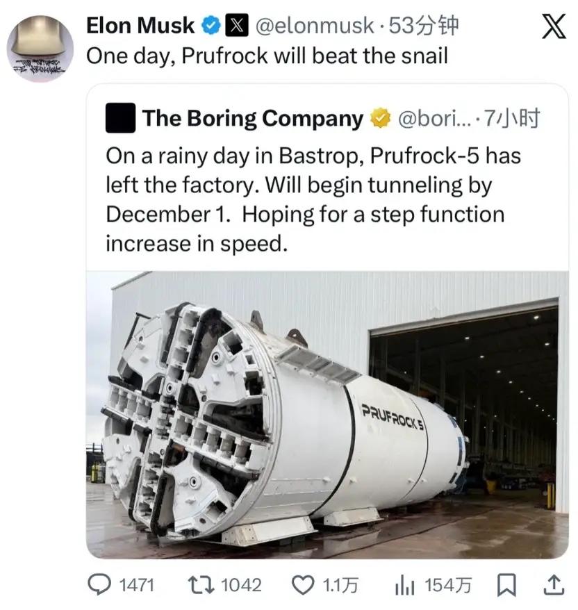 马斯克刚刚发帖炫耀自家公司的新一代隧道掘进机 Prufrock-5,这台机器被称为地下交通革命的核心,支持全自动掘进、无人作业、多层立体隧道。 如果成本真的做到地上高速公路价位,城市交通将从二维道路扩展到三维空间,堵车可能真的会变成历史。 盾构机这玩意儿已经没有革命性技术突破,除非转变掘进形式或改变施工方式,单就制造成本来说,未必有中国的有优势,也就是说地铁造价很难低于高速公路。 关键人家之前吹过的几个都实现了,而对于普通人来说,只要能实现一个就牛逼到天上了。他实现了不止一个。不用苛求全实现。马斯克已经是能留在历史书里的人了。 欧美市场需要它,我们的产品他们禁,老美的产品会畅通无阻。无人化降低成本,相较欧美老式盾构机有成本优势,一般工程预算能接受。其他市场没我们有优势。一家公司不能抗衡一个产业链。