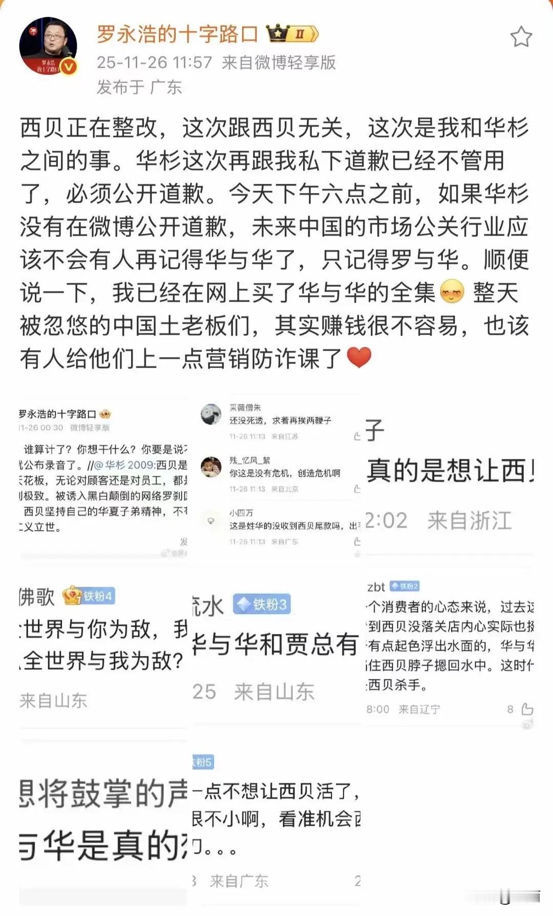 罗永浩生大气了。“今天下午6点之前必须道歉”!“这是我和华衫之间的事”!罗永浩火力全开,这次矛头不是对准西贝的,而是华与华的老板华衫。 原因是,华衫说西贝是被人算计了。这句话惹毛了罗永浩。 如果说上次罗永浩怼西贝还有所保留的话,这次却来势汹汹。 他表示,上次华衫私下道歉已经原谅他了,这次不行了如果华杉没有在公开道歉,未来中国的市场公关行业应该不会有人再记得华与华了。暗指华与华就是诈骗,他要给买过华衫服务的老板们上一堂营销防诈课。