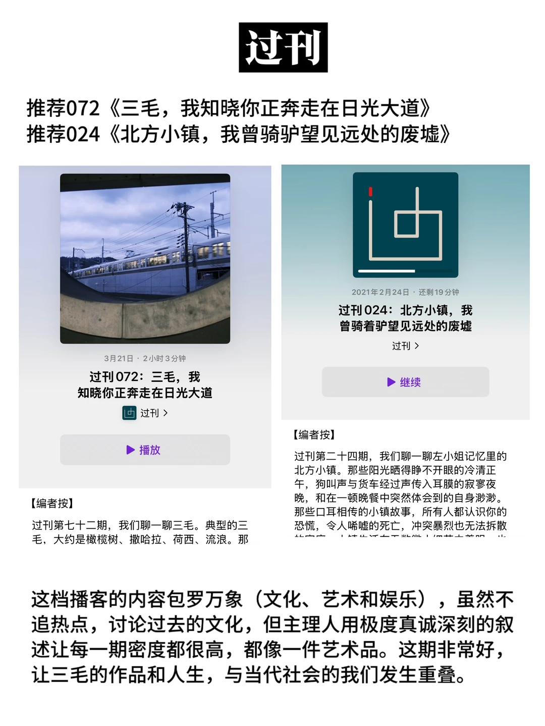内容包罗文化、艺术和娱乐,不追热点讨论过去的文化,但主理人深刻叙述让每期密度都很高,像艺术品。这期让三毛作品和人生,与当代社会的我们重叠