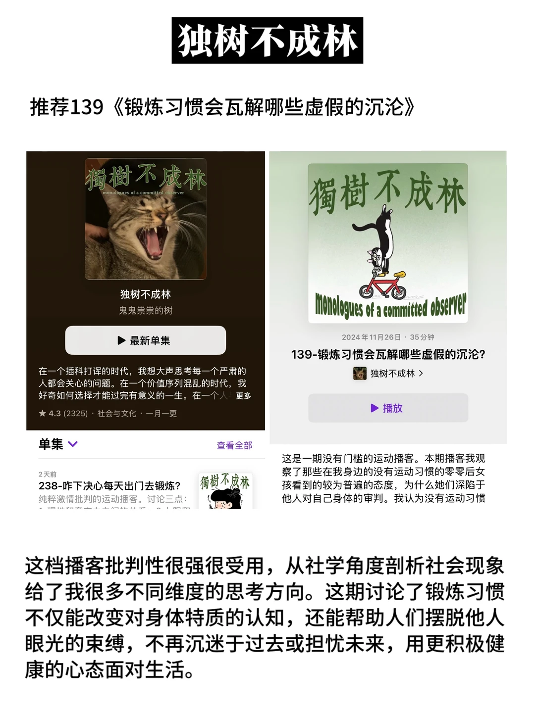 ▪️这档播客批判性很强,从社学角度剖析社会现象,给了我不同维度的思考方向。这期讨论锻炼习惯不仅能改变身体特质,还能帮助人们摆脱他人眼光的束缚。