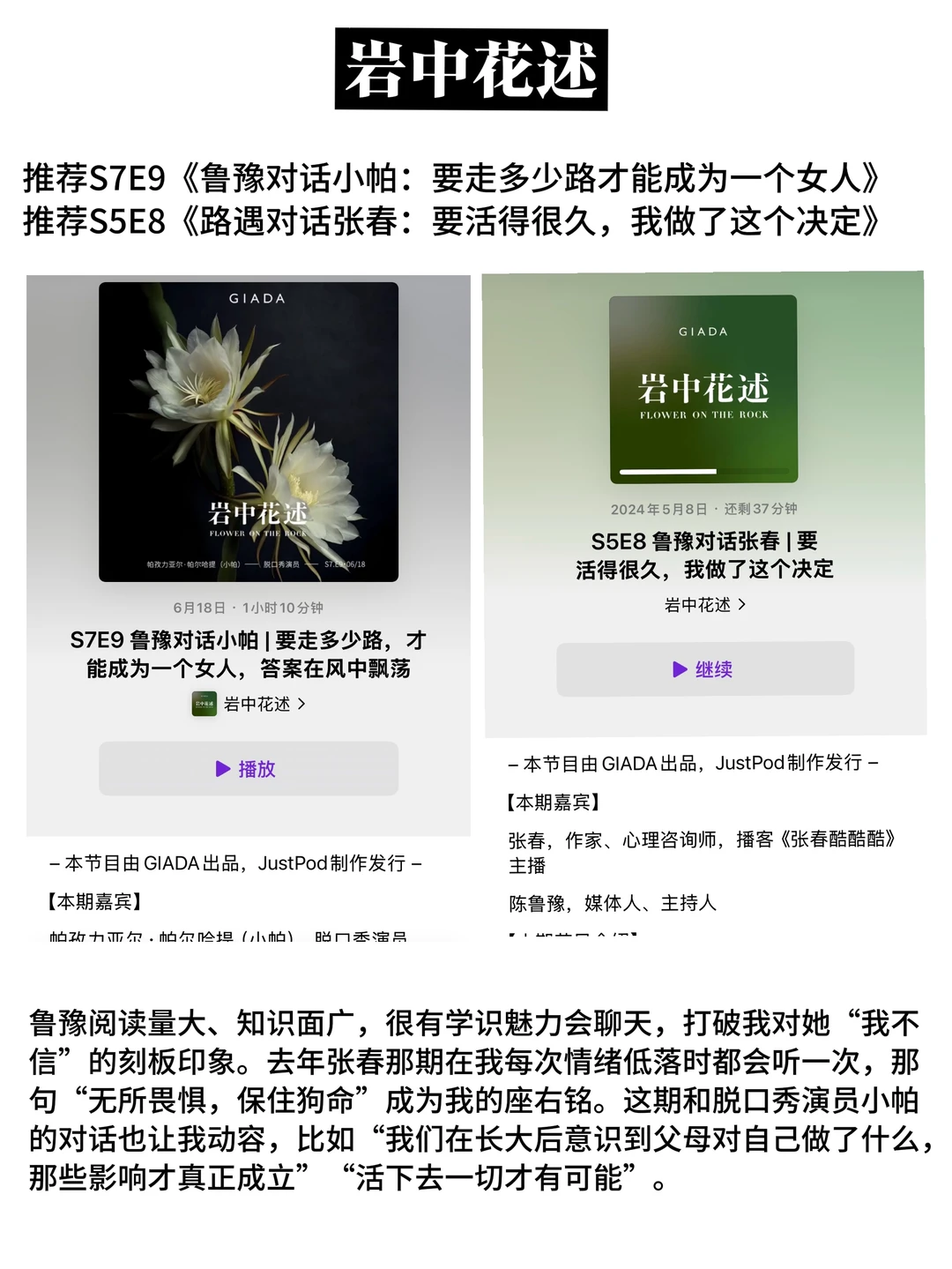 ▪️鲁豫阅读量大、知识面广,很有学识魅力,打破我对她“我不信”的刻板印象。去年张春那句“无所畏惧,保住狗命”是我的座右铭。这期和脱口秀演员小帕对话也让我动容,比如“我们在长大后意识到父母对自己做了什么,那些影响才真正成立