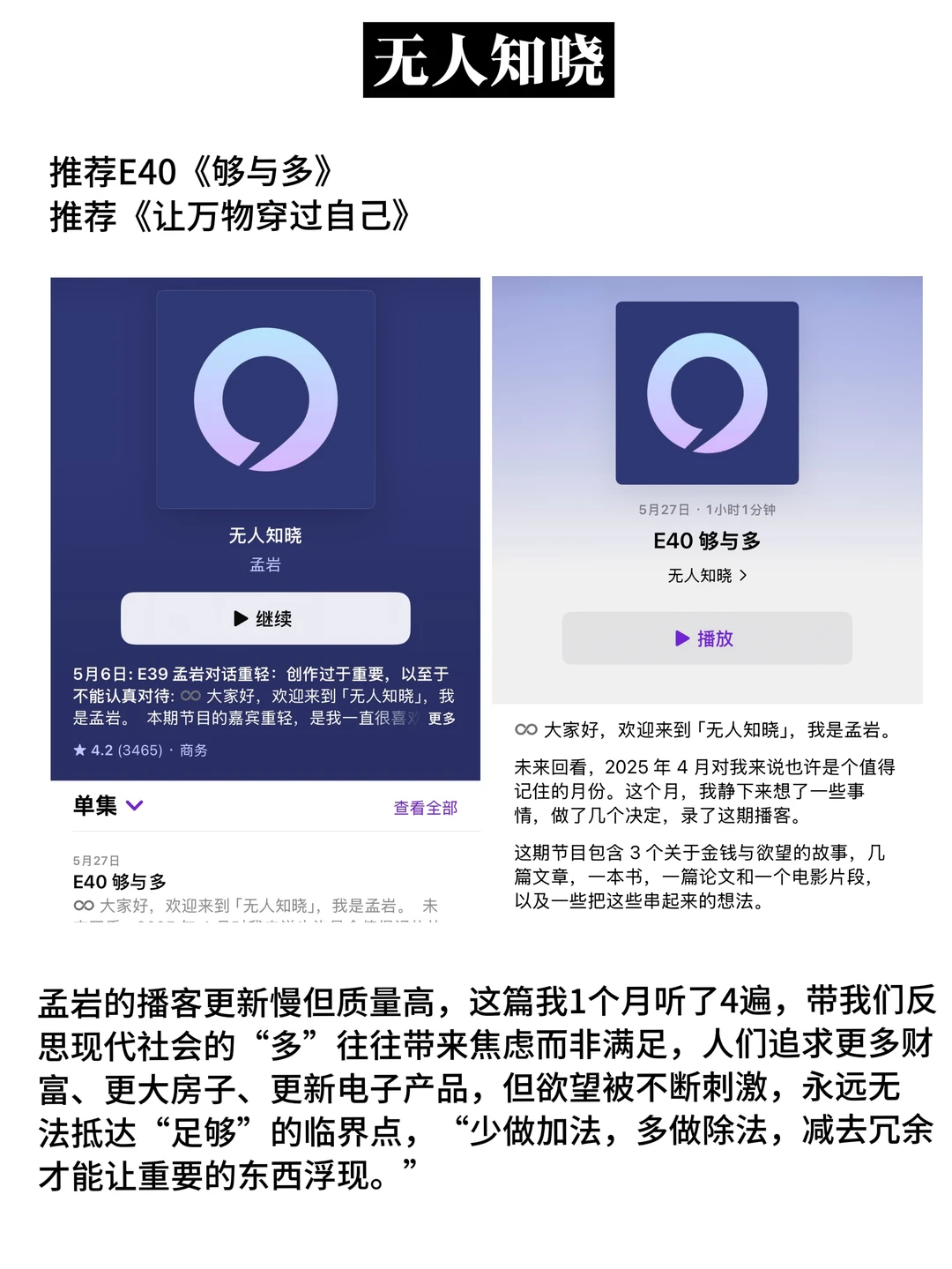▪️孟岩的播客更新慢但质量高,这篇我1个月听了4遍,带我们反思现代社会的“多”往往带来焦虑而非满足,人们追求更多财富、房子、电子产品,但欲望被不断刺激,永远无法抵达“足够”的临界