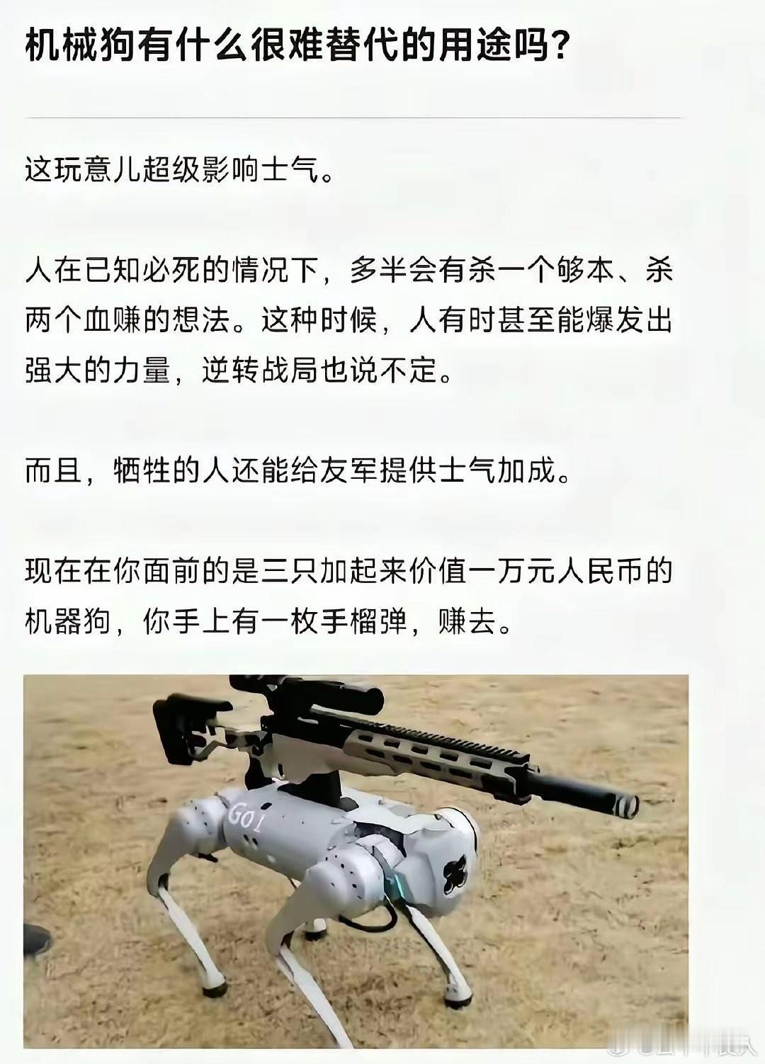 这个狗绝对没这么简单,要全地形,要对抗枪支的后座力,要对抗枪支发射的瞬间火药烟尘干扰,要对抗战场复杂电磁环境。 蛙蛙想玩山地游击,那就让机器狗、机器狼陪它们玩去吧。想玩躲猫猫,它们大概不知道有红外感温这种东西。军事机械狗 全地形机器狗