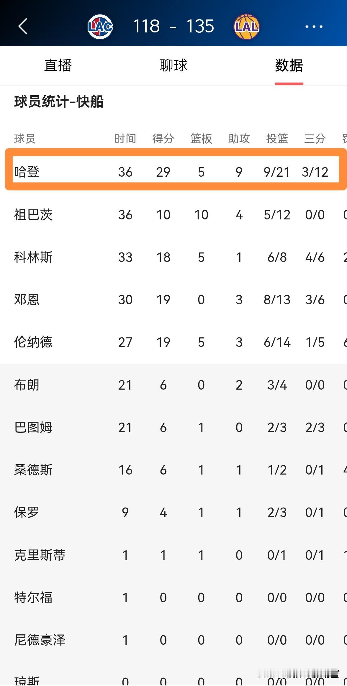 我真被快船巨星哈登给气疯了!在今天快船客场以118:135惨败于湖人的比赛中,哈登不仅在进攻端效率低下,而且在防守端被东契奇打爆,他的表现真是一塌糊涂。 全场比赛下来,哈登首发出战36分钟,投篮21中9,其中三分球12中3非常低效的得到29分,还出现了5次失误。 作为一名控卫,哈登疯狂的出手21次,这本身就是不合理的,他在投篮和传球方面完全失去了平衡。