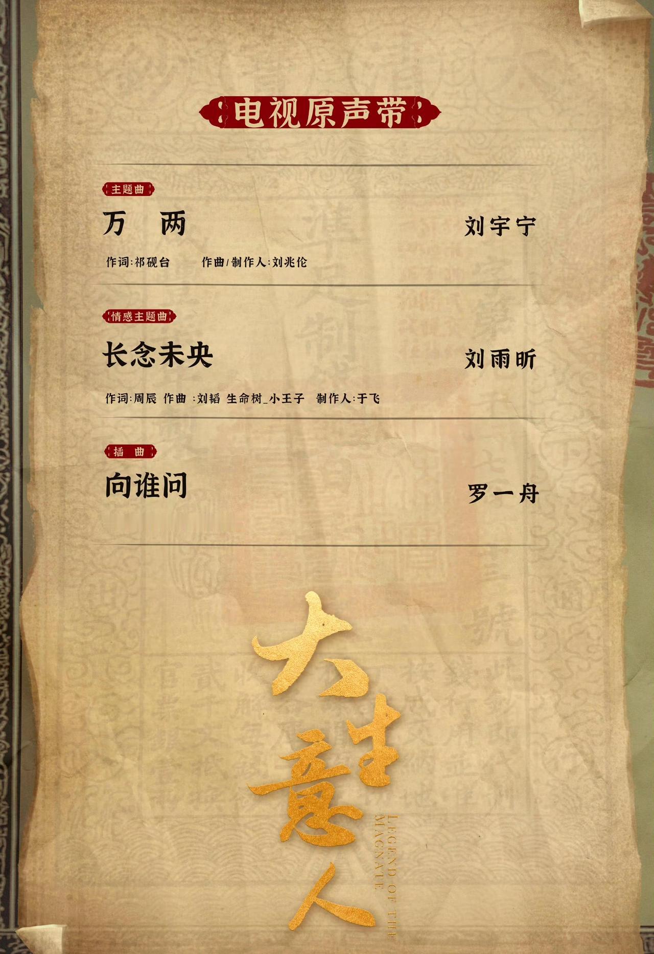 《大生意人》OST阵容曝光!刘宇宁刘雨昕加盟,这才是顶配声画联动! 刘宇宁献唱主题曲《万两》,嗓音里自带江湖与金戈,一开口便是商海沉浮的磅礴气象——那是古平原在商场搏杀时的万丈豪情,每个音符都砸在人心最沸腾处。 刘雨昕演绎情感曲《长念未央》,声线细腻如丝,却缠住万千情愫。她唱的是江南月与常四爷的未了情缘,乱世中欲语还休的牵念,都在她流转的歌声里生了根。 这两首金曲,一首燃尽热血,一首揉碎柔肠。当歌声遇见剧情,我们听见了整个跌宕起伏的时代。