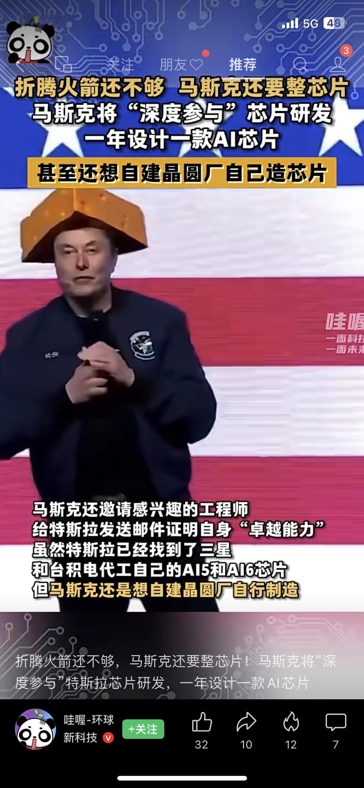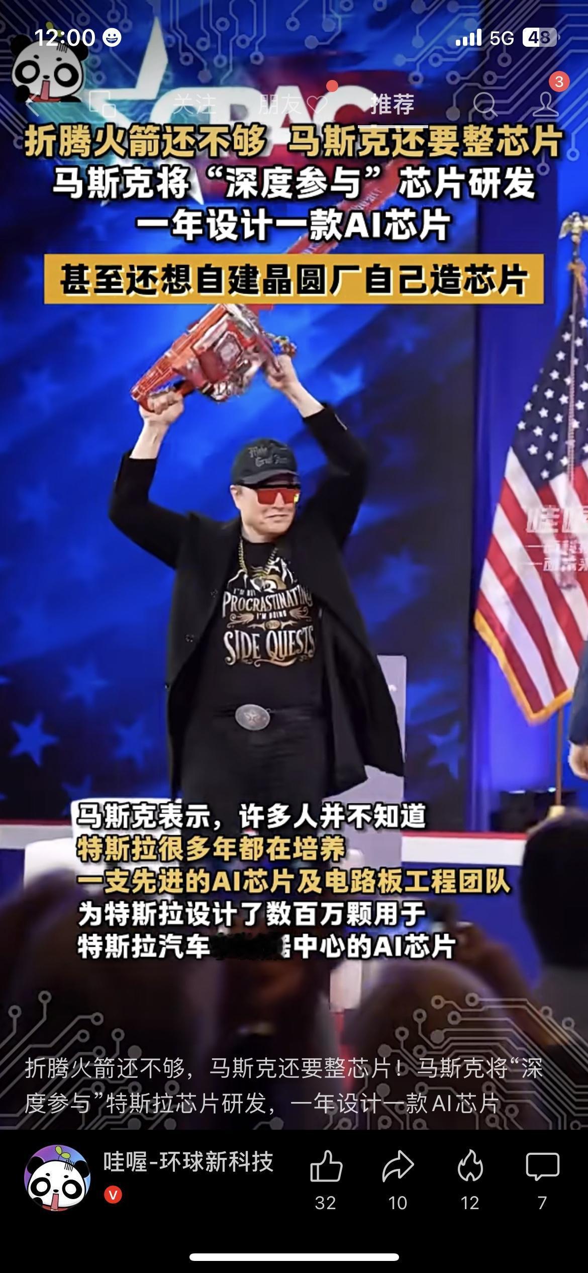 马斯克又搞大事!造完火箭造芯片,还要自己建晶圆厂?这是要“垄断”AI产业链? 马斯克是真闲不住——刚把火箭送上天,又要“深度参与”芯片研发,放话“一年设计一款AI芯片”,甚至想自建晶圆厂自己造芯片!网友们都在调侃:“这是要把整个AI产业链都包圆了吗?” 要知道,特斯拉早就有芯片团队了,之前给汽车和数据中心做的AI芯片,已经用了几百万颗。现在找三星、台积电代工还不够,非要自己建厂,这是想把芯片的“设计+制造”全攥在手里啊? 有人说他是“野心太大”,芯片行业烧钱又难搞,连苹果都没敢自己建厂;但也有人觉得,马斯克是为了摆脱供应链卡脖子——毕竟AI芯片需求越来越大,自己造能省成本还能控节奏。 不过话说回来,芯片不是火箭,技术门槛高到离谱,他这波操作能成吗?你觉得马斯克能搞成自己的芯片帝国不?评论区等你聊!马斯克 特斯拉马斯克