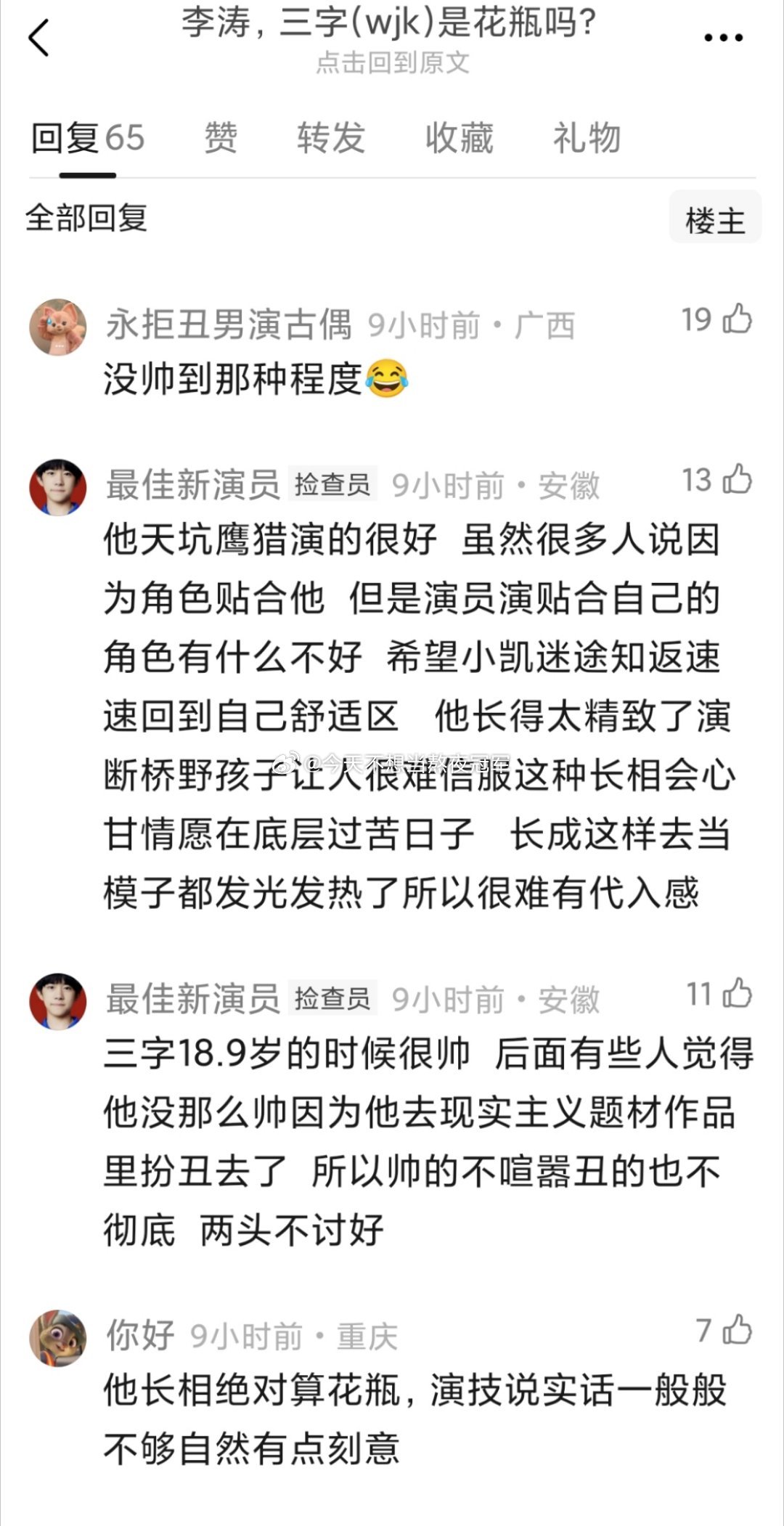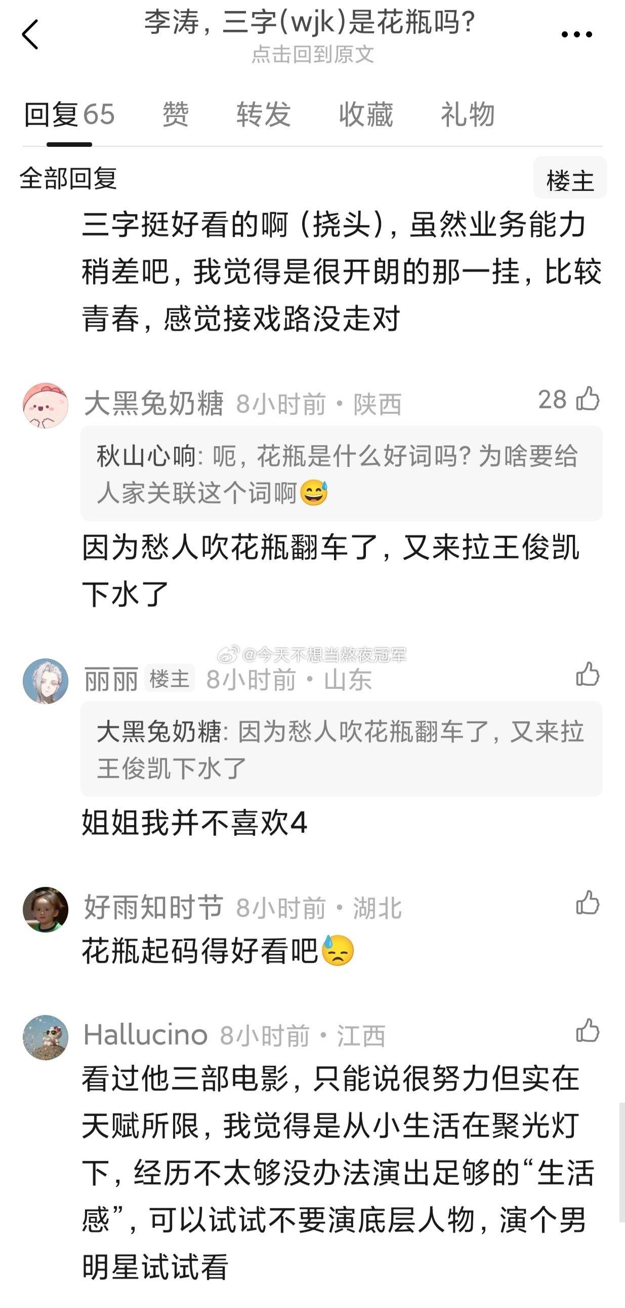 网友聊初代养成系的转型之路,说王俊凯现在的处境很尴尬,问三字现在的定位难道是属于花瓶型艺人吗三字最擅长唱歌,但一年到头也没几个舞台。 连着拍了几年电影,既演了主旋律,又扮丑演了小众群体,又合作了大导影帝,结果一部能票房能拿得出手的都无。在颜值巅峰时期也没有留下一部偶像剧。用顶级国民度打出了一手四不像的烂牌。。。所以客观说,三字的问题是出在哪里了?到底是路线没选对,还是演技支棱不起来