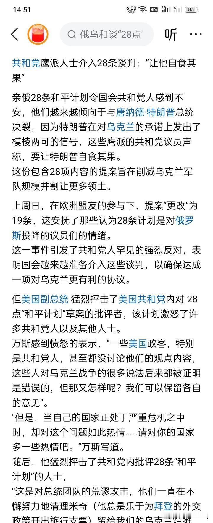 惹祸上身? 似乎疯狂传播的、无视乌克兰国家领土和主权完整的、结束乌克兰战争的28条和平协议草案,现在才知道,原来好像是美国副总统万斯搞出来的。 但是,这个28条和平协议草案,不仅遭受到乌克兰的拒绝,以及欧洲相当一些国家的指责和批评,在美国总统特朗普的共和党内的高层也遭到了批评。有共和党议员好像表示不久之后将辞职,也有共和党人士好像表示将与特朗普决裂,让他们自食其果等等。 因为实际上,在美国支持乌克兰进行抵抗行动的不是个别人、少部分人,而是相当多的一部分人。再说,是否支持乌克兰的抵抗行动,又与是否能够与欧洲保持、搞好传统的良好关系紧密相联。 因此,是否支持和援助乌克兰,在美国好像是个大事大非的问题,似乎绝对不是某个官员拍拍脑袋就可以完全决定。