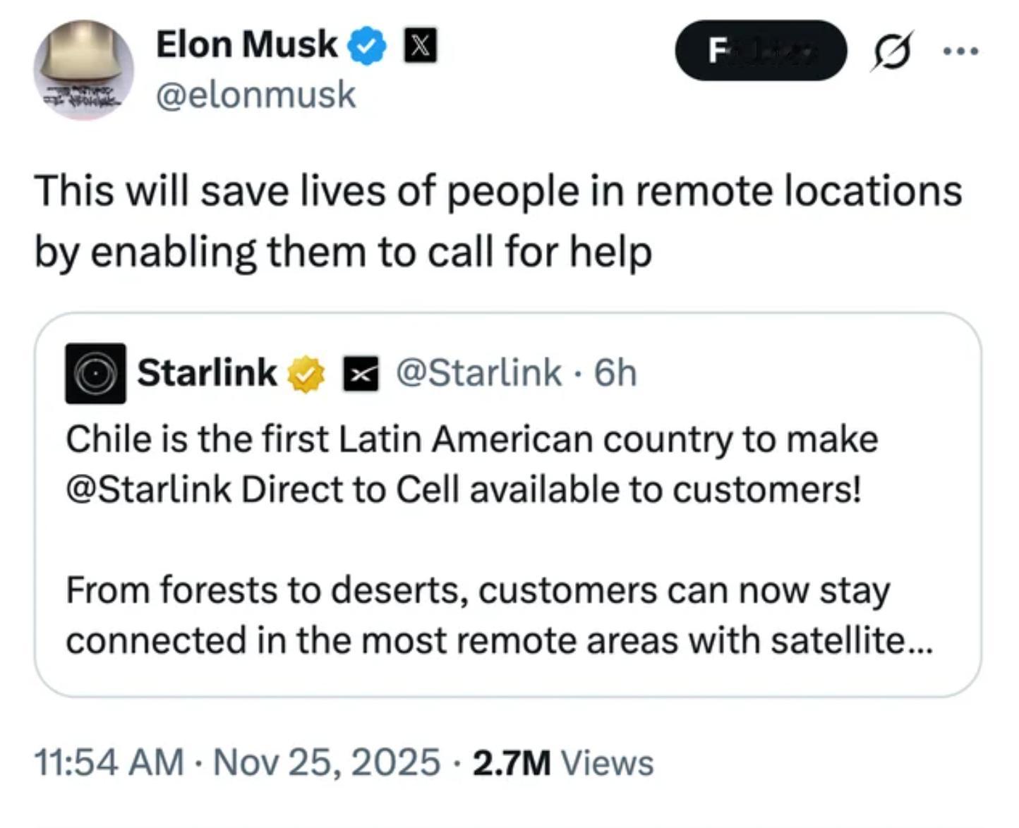 马斯克把Starlink带到了一个更实际的场景:救援。Starlink 宣布:智利成为拉美首个支持“卫星直连手机”的国家,不换卡不换手机,在森林、沙漠这种信号黑区,也能直接打电话、发短信、求救。虽然目前只在智利试点,但技术路线已经跑通了。