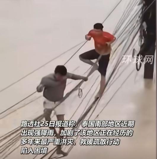 泰国人这几天简直是在“水牢”里抢命,11月底南部的雨跟倒了一整湖似的,合艾市一天的雨能淹到小腿肚,三天攒下来直接没到胸口,好好的街道成了“泡澡池”,房子半截泡在水里,一推家门浑水“哗啦”往屋里灌。 困在里头的人没别的辙只能拿命赌,有人逼得没招,光脚踩在泡得发亮的电线上挪步,脚底下是晃荡的浑水,手抓着旁边的线,整个人跟吊在半空似的,旁边房顶的街坊看得直喊“别抖!”,自己手心先冒了满手汗。 还有人把几个泡沫箱捆成“求生筏”,蹲在上头用塑料板划,浪一撞箱子就歪,整个人跟着往水里栽,手指抠得箱子都变形了。 更多人只能爬房顶,裹着湿衣服蜷成一团,满街露在水面的屋顶,活像一个个漂着的“孤岛”。 而这水谁也没饶过,泰国南部9个府全泡了汤,到现在41个人没了,268万多人被困,有的村子连块干地都找不着,救援车陷在泥里动不了,直升机绕着水圈落不下去。 就算政府连海军航母都调来了当“移动急救站”,可水涨得比救兵还快。 当网友刷到视频直接破防:“这哪是活着啊,是拿命蹭口气!看他踩电线那下,我腿都软了。” 这场“几百年遇不上”的洪水把家变成了绝境,踩电线、划泡沫箱的不是胆子大,是实在没路走,就盼着这雨赶紧歇菜,救援的能快点钻到水里头,别再让谁拿命换这一趟了。