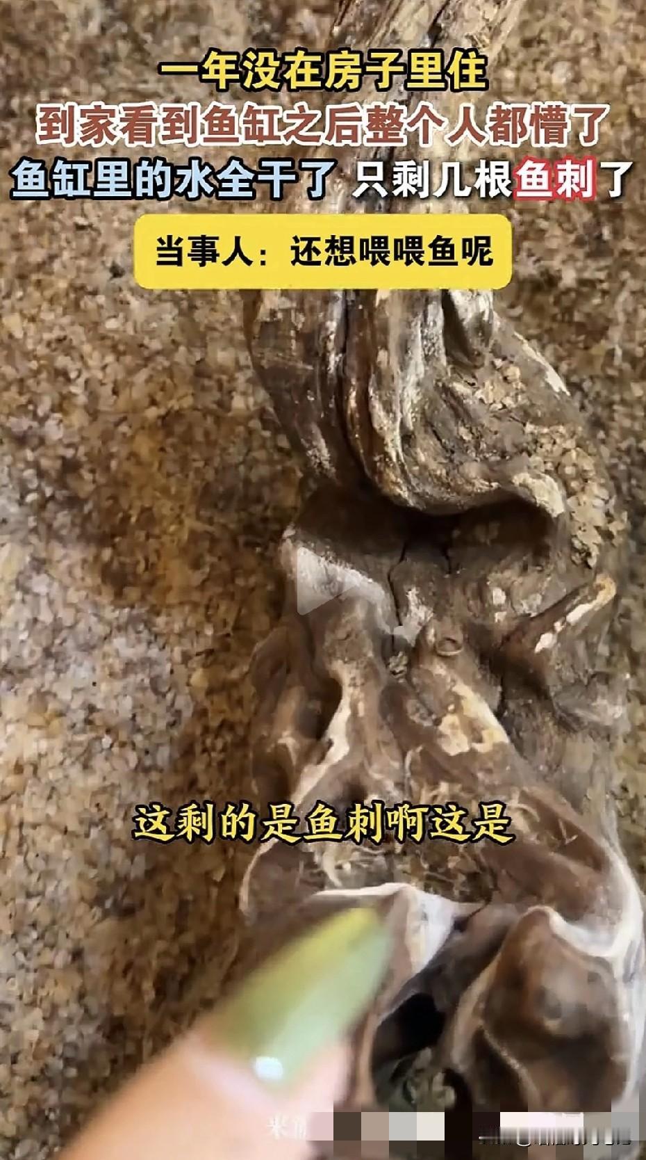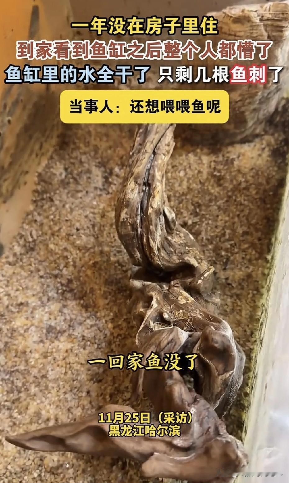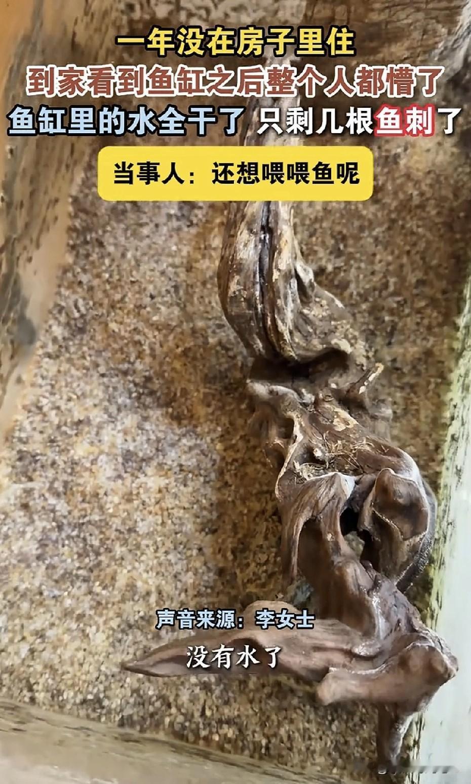 供暖季的“惨案”。哈尔滨李女士离家整整一年,回家推门第一眼差点原地石化:鱼缸见底,只剩几根灰白鱼刺贴在玻璃上,像被时间风干的“标本”。 她这才想起离家前只给鱼留“半缸水”,结果东北暖气太猛,水分日夜蒸发,几条鱼从扑通到干涸,全程无人“喊停”。 李女士把视频发上网,自嘲“把宠物养成了考古”,评论区瞬间炸锅:有人心疼鱼,有人心疼她,还有人惊呼:原来供暖不仅能烘干袜子,还能烘干生命。 说到底,这不是鱼太脆弱,而是“被遗忘”三个字太锋利。现代生活节奏越快,我们越容易把“照顾”想成理所当然:鱼会自己喝水、植物会自己晒太阳、亲人会自己照顾自己……直到某天回家,发现鱼缸成沙盆、绿萝成标本、父母背影佝偻,才惊觉“以为来日方长,其实只剩尾巴”。 鱼变鱼刺,是供暖季的黑色幽默,也是生活发出的红色警报:别把“以后”当借口,把“现在”过成省略号! 屏幕前的朋友们,如果您离家一个月,家里最该被“托孤”的是什么?评论区聊聊,一起补全那些被遗忘的照顾。 [图源网络]