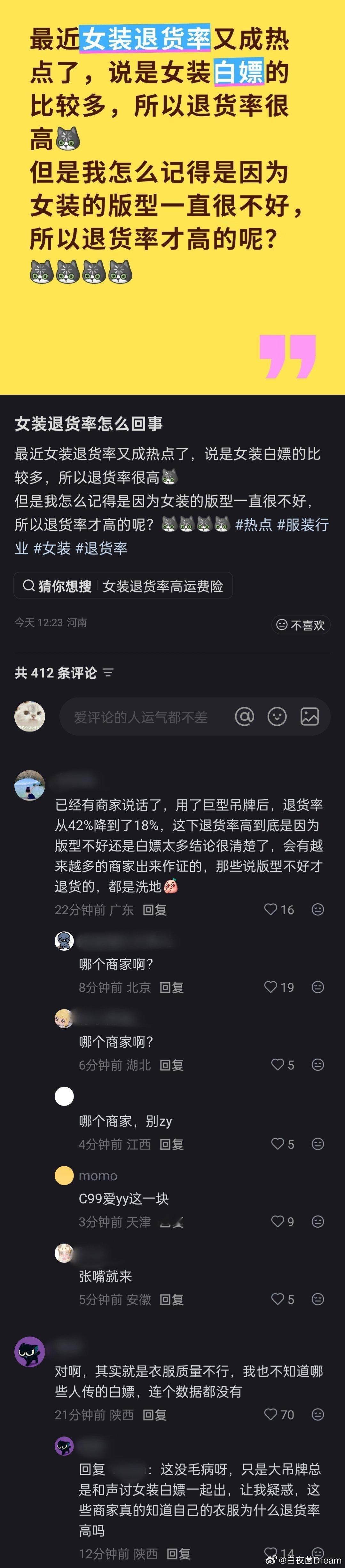 果然又岁月史书了,说女装是因为版型不好和质量不好,所以退货率才高。明明媒体已经调查过了,启用巨型吊牌后,店铺恶意退货率从42%大幅降至18%,但总有人装作看不见,反复问数据在哪,哪个商家。根本叫不醒装睡的人。巨型吊牌一个月卖出近百万个