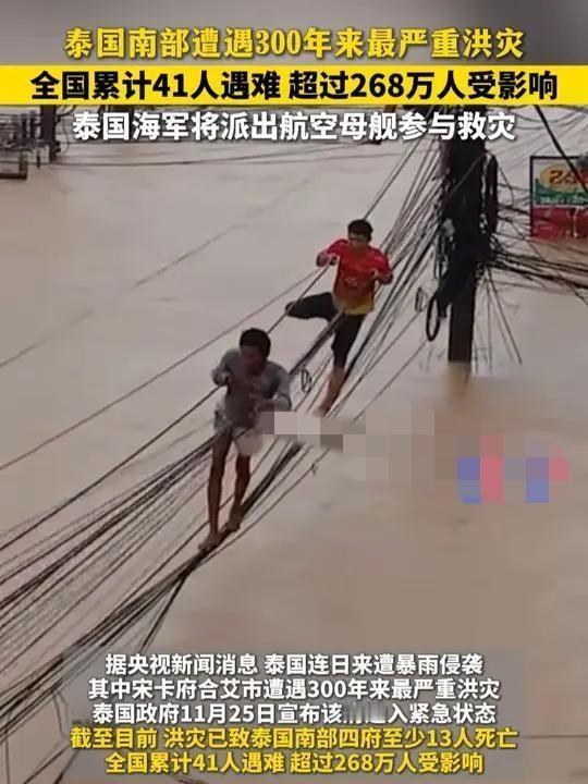 泰国遭300年一遇特大洪灾!航母紧急救灾,268万人受灾,新生儿在黑暗中被守护 太揪心了!泰国正遭遇近三个世纪以来最严重的洪灾,南部宋卡府合艾市简直成了“泽国”,单日降雨量飙到335毫米,打破300年纪录,洪水最深超2.5米,汽车被直接冲走,商业街全被淹没! 截至目前,全国已有41人遇难,268万人受影响,9个府被洪水围困,连泰国第五大城市都陷入瘫痪。更让人揪心的是,合艾医院的30名新生儿被困,洪水涨到二楼,断电断水后护士只能靠一盏灯、一台风扇守护宝宝,父母们因交通中断根本无法探望! 关键时刻,泰国海军出动了唯一的“扎克里”号航母救灾!这艘航母变身“浮动医院”,带着14艘船只、直升机、医生和移动厨房,每天能供应3000份餐食,橡皮艇、军用卡车也全员上阵转移民众。还有1000多名马来西亚、新加坡游客被困酒店,如今已陆续被疏散,有人拖着行李在齐腰深的洪水里艰难前行,不少民众只能抱泡沫箱当“救生圈”,甚至爬上屋顶、电线“走钢丝”求援。 这场洪灾的影响远超想象:12万公顷橡胶园被淹,预计减产1万吨;普吉岛、苏梅岛等热门景点航班取消超200架次,酒店入住率跌到15%,每天经济损失高达10-15亿泰铢。更糟的是,气象部门说强降雨还会持续,洪水风险没解除,邻国马来西亚也有1.5万人被迫转移。 中国驻泰国大使馆已提醒公民别去受灾地区,被困同胞记得及时联系求助。洪水无情人有情,希望雨能早点停,救援能顺利推进,愿受灾民众都能平安! 曼谷水灾