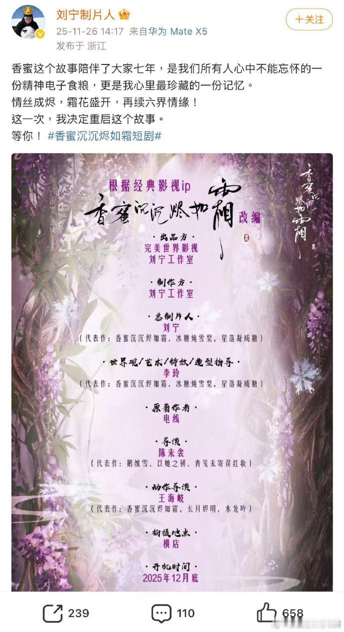 香蜜小说原作者辟谣改编短剧 《香蜜沉沉烬如霜》小说原作者昨天明确辟谣了,说自己完全不知道要被改成短剧。今天剧版制片人刘宁发博宣布要以短剧形式重启这个故事。