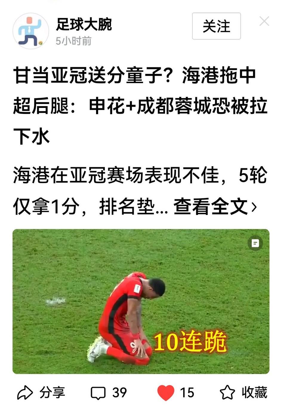 这位球迷心真细,说海港对亚冠没兴趣,甘当送分童子是拖申花和蓉城的后腿,真实目的是把两队一同拖下水。 仔细想来,海港输球未必是故意,但对亚冠应付了事明眼人都看得出来,这客观上导致日韩泰马球队都能在海港身上拿3~6分,让申蓉两队相当于-3~6分起跑,陪着海港一起垫底。 估计亚足联也没想到中超有海港这样坑本国队伍的球队,否则不会做如此混编的改革。当然,亚足联也许看到了其中的诡异,所以削减了中超球队打亚冠的名额。明年若足协杯冠军在亚精附加赛失手,没人陪看玩,海港又能坑谁呢?