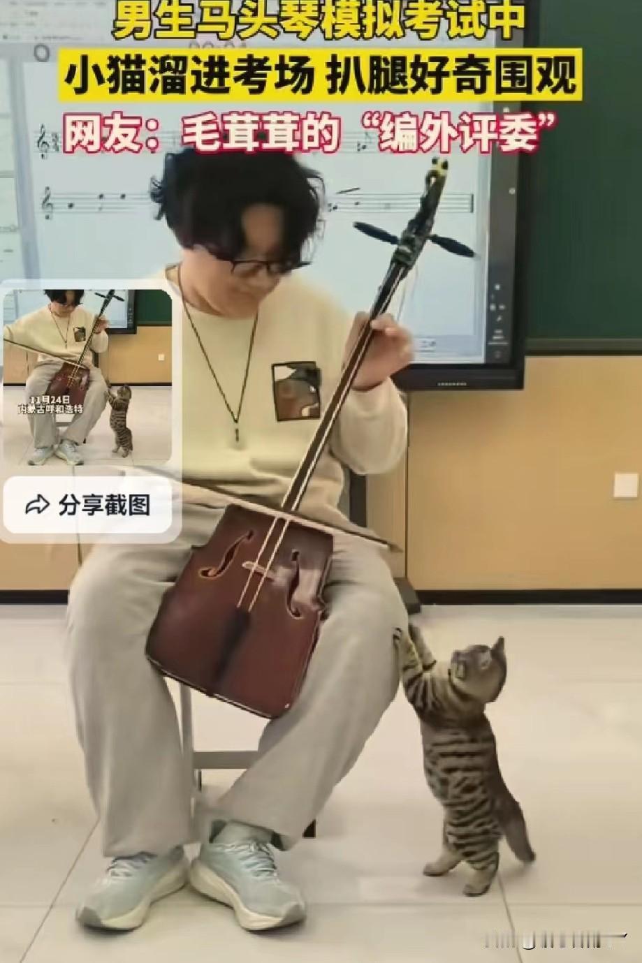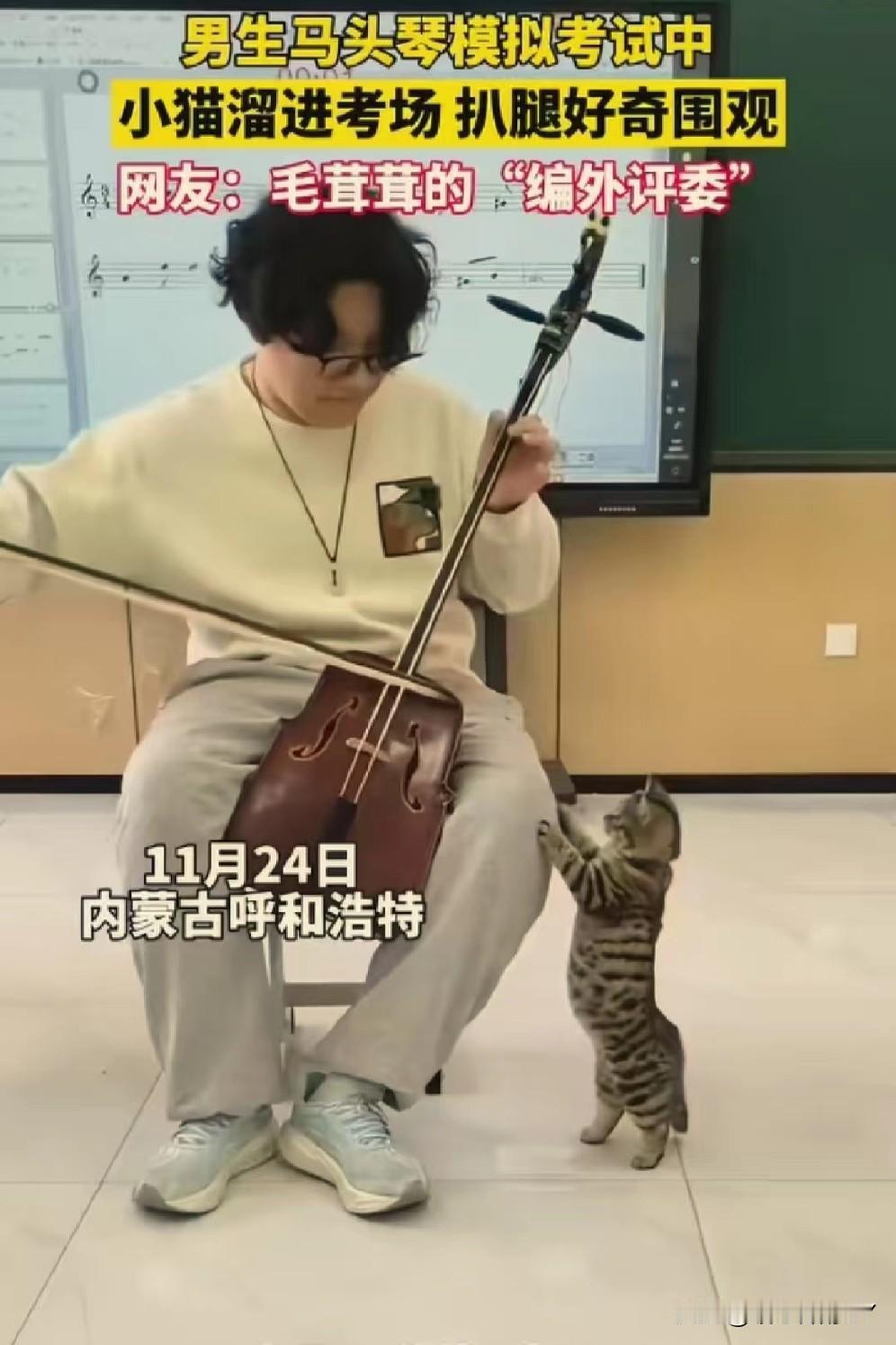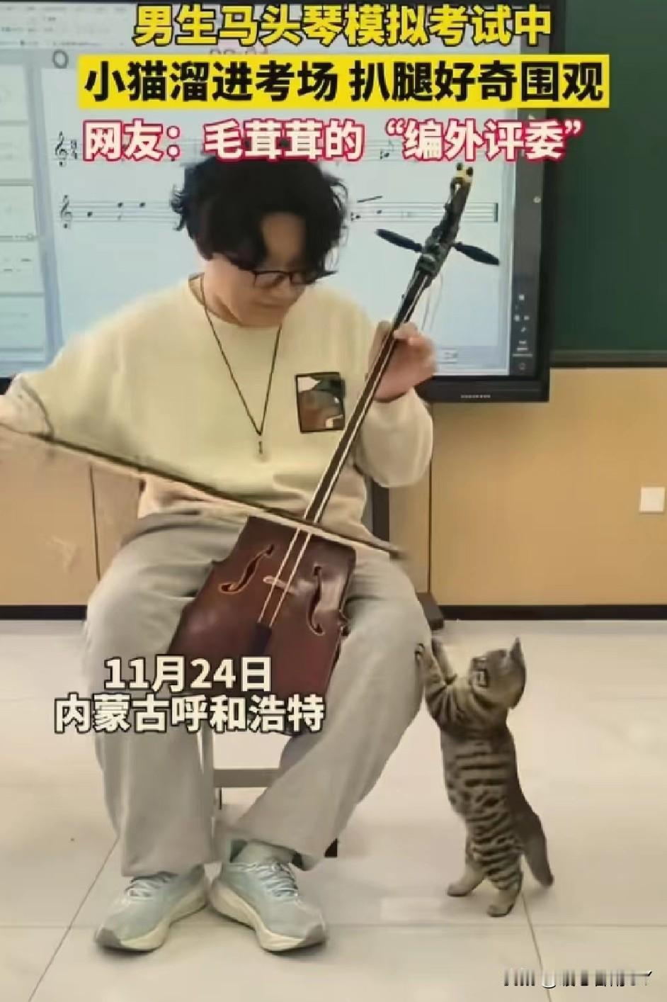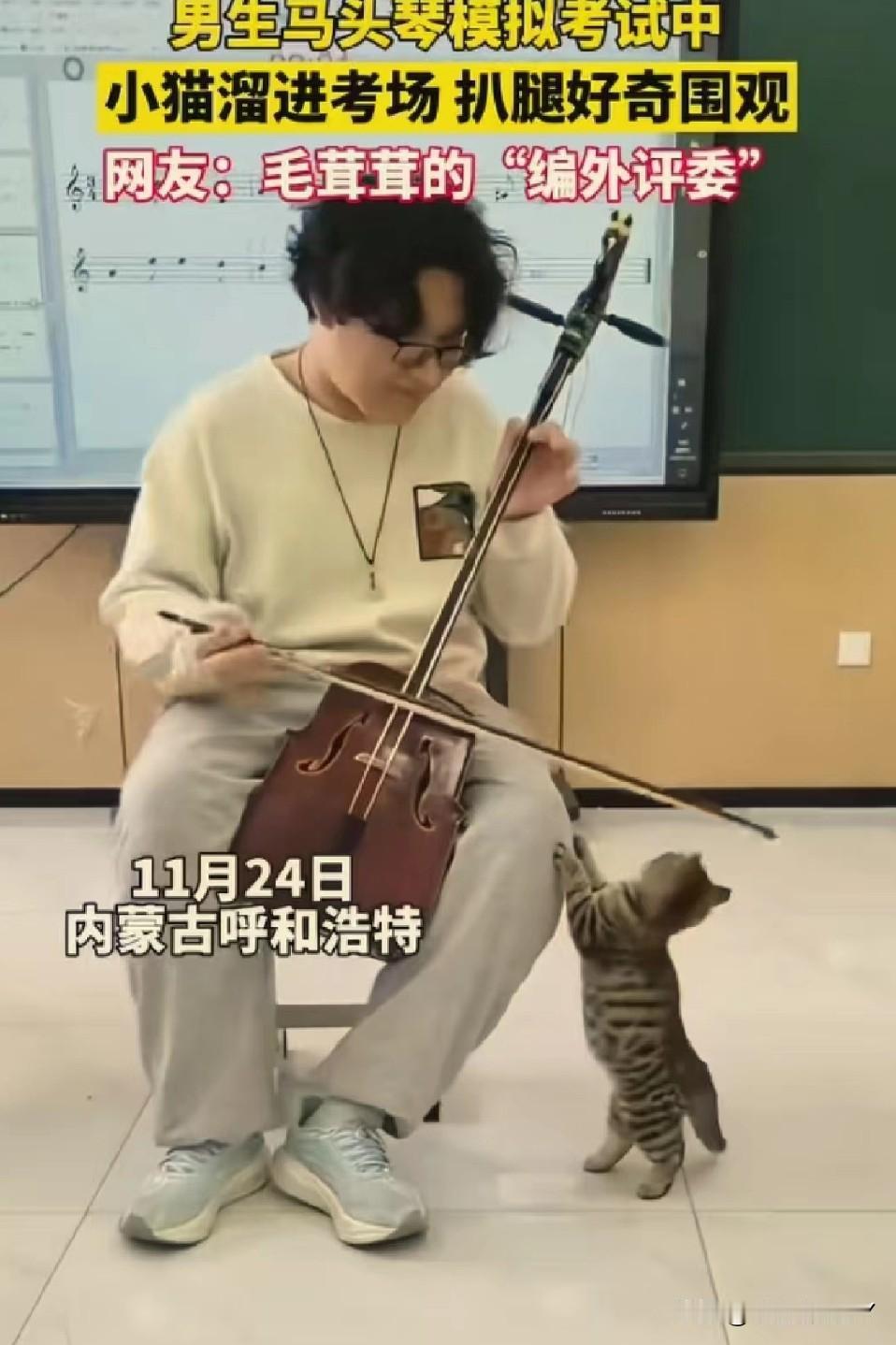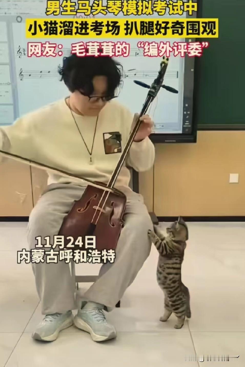 考场惊现“毛茸茸编外评委”,马头琴考试现场被小猫萌化了! 11月24日,内蒙古呼和浩特的一间教室里,一场马头琴模拟考试正进行着。 一名男生全神贯注地拉奏着马头琴,忽然,一只虎斑小猫悄悄溜进考场,蹭到他腿边,仰着小脑袋好奇地张望,还伸出小爪子轻轻扒拉,模样萌趣又认真。 这突如其来的“听众”,让紧张的考试增添了一抹温暖。 网友纷纷打趣道:这是“毛茸茸的编外评委”来监督考试啦! 在充满压力的考试中,小动物的意外闯入,像一缕治愈的阳光,把音乐中的热爱和生活里的可爱,完美融合,谁看了能不感到暖心又治愈呢~冬日生活打卡季 创作训练营开营啦
