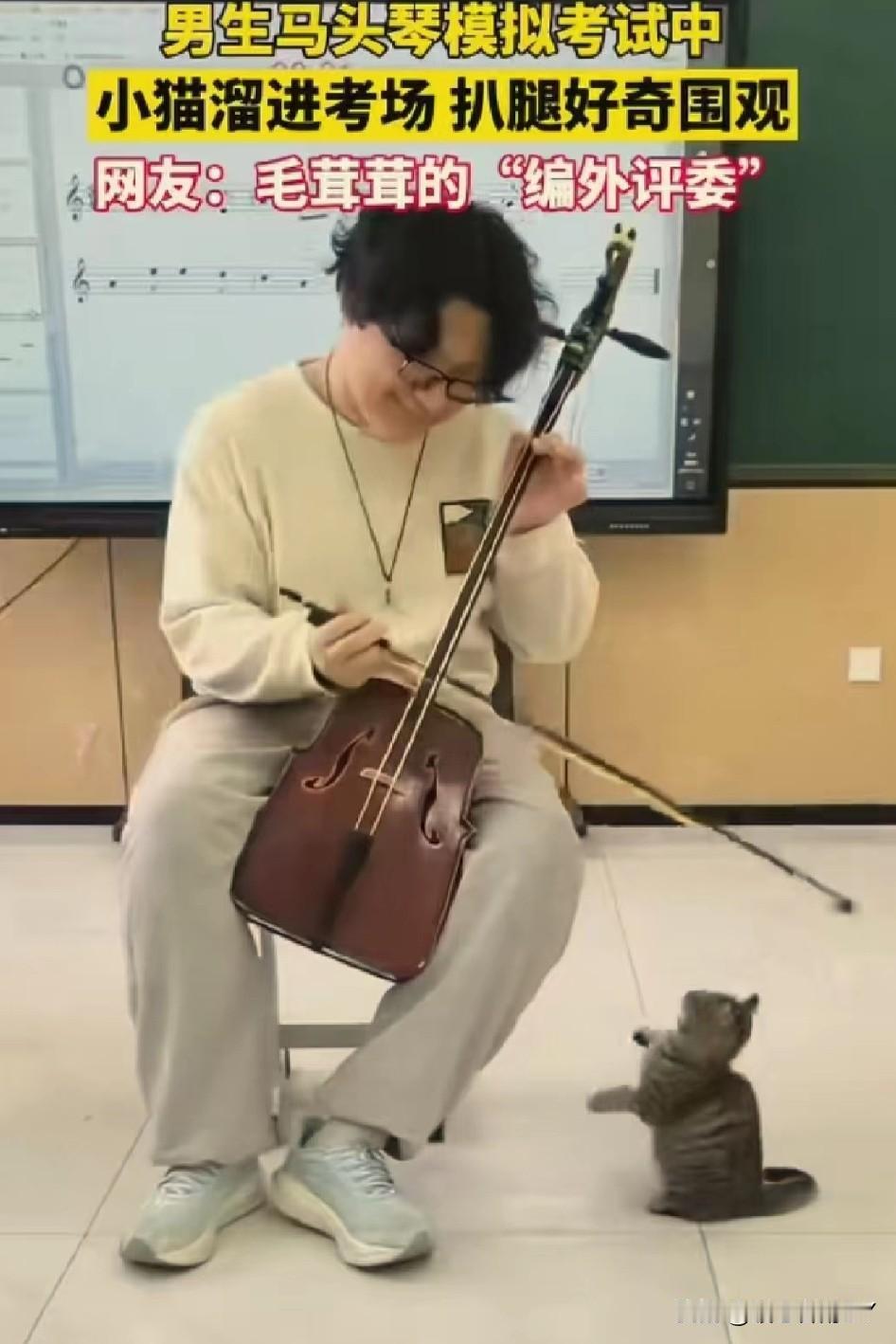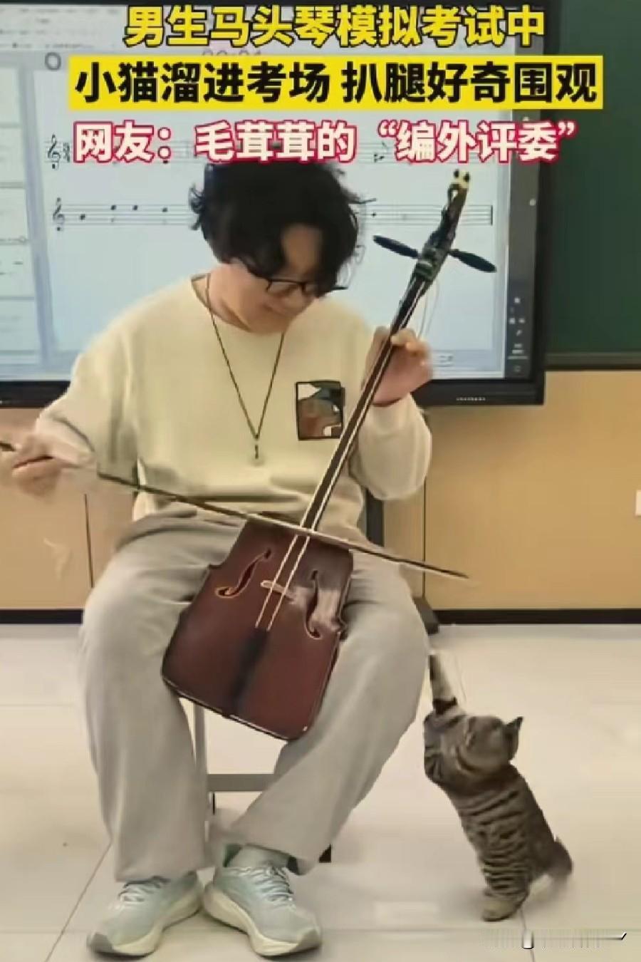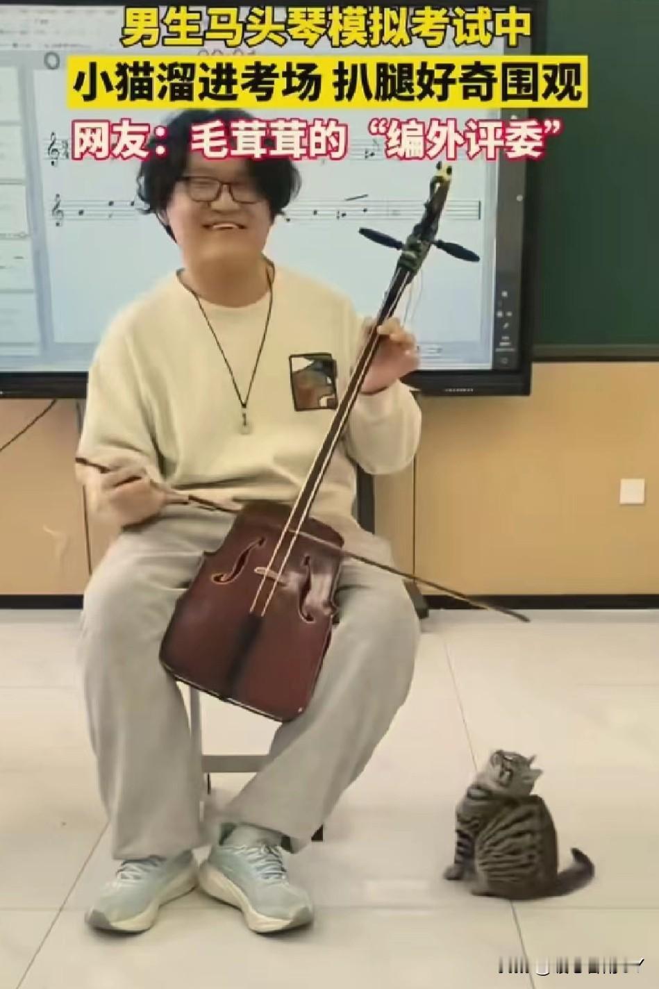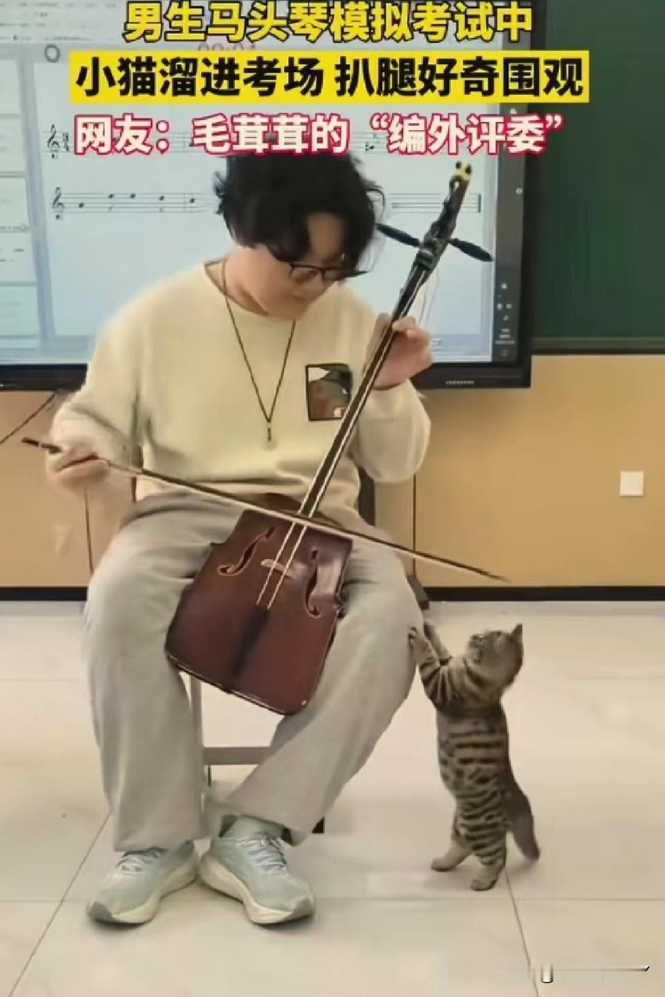 考场惊现“毛茸茸编外评委”,马头琴考试现场被小猫萌化了! 11月24日,内蒙古呼和浩特的一间教室里,一场马头琴模拟考试正进行着。 一名男生全神贯注地拉奏着马头琴,忽然,一只虎斑小猫悄悄溜进考场,蹭到他腿边,仰着小脑袋好奇地张望,还伸出小爪子轻轻扒拉,模样萌趣又认真。 这突如其来的“听众”,让紧张的考试增添了一抹温暖。 网友纷纷打趣道:这是“毛茸茸的编外评委”来监督考试啦! 在充满压力的考试中,小动物的意外闯入,像一缕治愈的阳光,把音乐中的热爱和生活里的可爱,完美融合,谁看了能不感到暖心又治愈呢~冬日生活打卡季 创作训练营开营啦