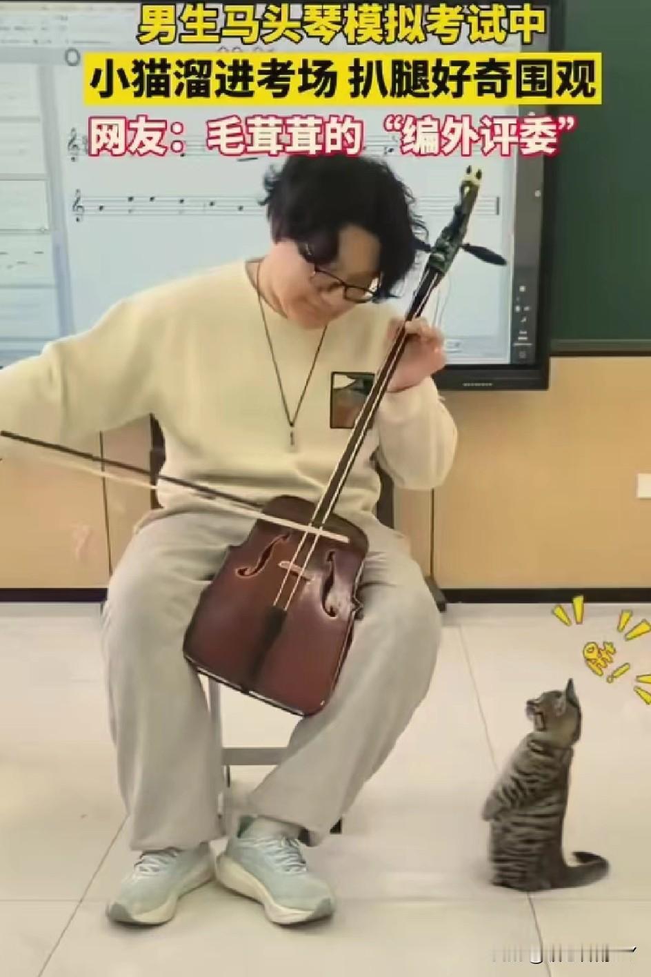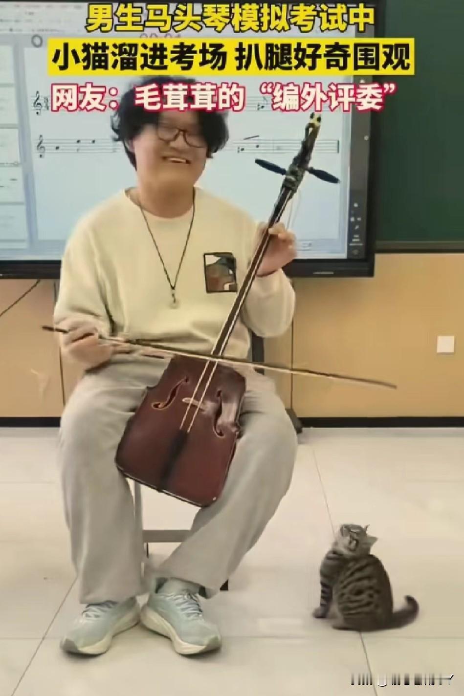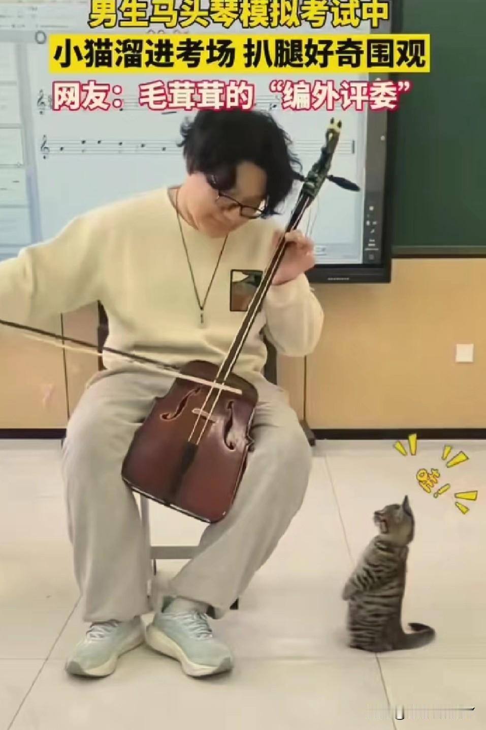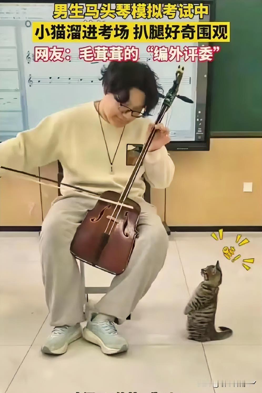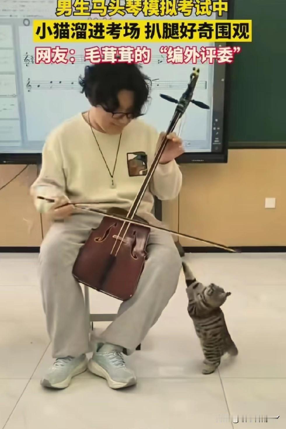 考场惊现“毛茸茸编外评委”,马头琴考试现场被小猫萌化了! 11月24日,内蒙古呼和浩特的一间教室里,一场马头琴模拟考试正进行着。 一名男生全神贯注地拉奏着马头琴,忽然,一只虎斑小猫悄悄溜进考场,蹭到他腿边,仰着小脑袋好奇地张望,还伸出小爪子轻轻扒拉,模样萌趣又认真。 这突如其来的“听众”,让紧张的考试增添了一抹温暖。 网友纷纷打趣道:这是“毛茸茸的编外评委”来监督考试啦! 在充满压力的考试中,小动物的意外闯入,像一缕治愈的阳光,把音乐中的热爱和生活里的可爱,完美融合,谁看了能不感到暖心又治愈呢~冬日生活打卡季 创作训练营开营啦