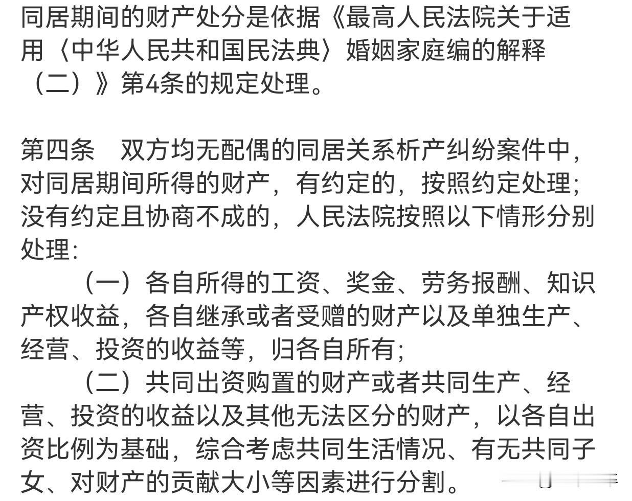 最高检将婚前同居纳入家庭成员是司法的突破,本是填补反家暴法律空白的进步之举,却因财产分割、量刑轻重、认定标准等衍生问题陷入争议漩涡。 这个法条主要是针对“家暴”中的家庭成员范围作出的扩大解释,同居关系也受反家暴法的保护,而不是有些人胡扯到的“婚前同居=结婚”。同居就是同居,不等于结婚,否则结婚证还有什么用了。 并且在财产纠纷的问题上, 同居期间的财产处分是依据《最高人民法院关于适用〈中华人民共和国民法典〉婚姻家庭编的解释(二)》第4条的规定处理。(图二) 在家庭暴力问题中确实是有争论的,公众关注恐惧的问题是把故意伤害罪被"降级"为虐待罪(虐待罪最高刑期7年,故意伤害罪可判死刑)。家暴致死案中,若按虐待罪判罚,相比非家庭成员故意伤害致死的刑罚显著偏低。但是根据公开的信息,至21年起,全国检察机关共批准逮捕涉家暴犯罪嫌疑人2800余人,起诉3400余人。其中有500余名家暴犯罪案件被告人被判处无期徒刑以上刑罚。这就可以解释为不必担心了。 再有就是何为稳定同居?何为事实上的家庭关系人?没有全国统一的标准,这是否会造成各地执法尺度不一?在一方有配偶的情况下,又与他人稳定同居,是否成立重婚罪?一般的老百姓学习法律、了解法律的主要方式和渠道,并非是阅读立法和司法解释,而是从典型案例、热点判例中学习和认知的。以上的困惑需最高检给出细化共同生活基础标准(共同生活时间持续6个月以上、经济上是否互助、社交公开的信息),避免裁决混淆。 出台新的法律需警惕标签背后的责任模糊,真正的进步不在身份认定,而在每一次对待犯罪分子的处罚都能被公正量刑。婚前同居