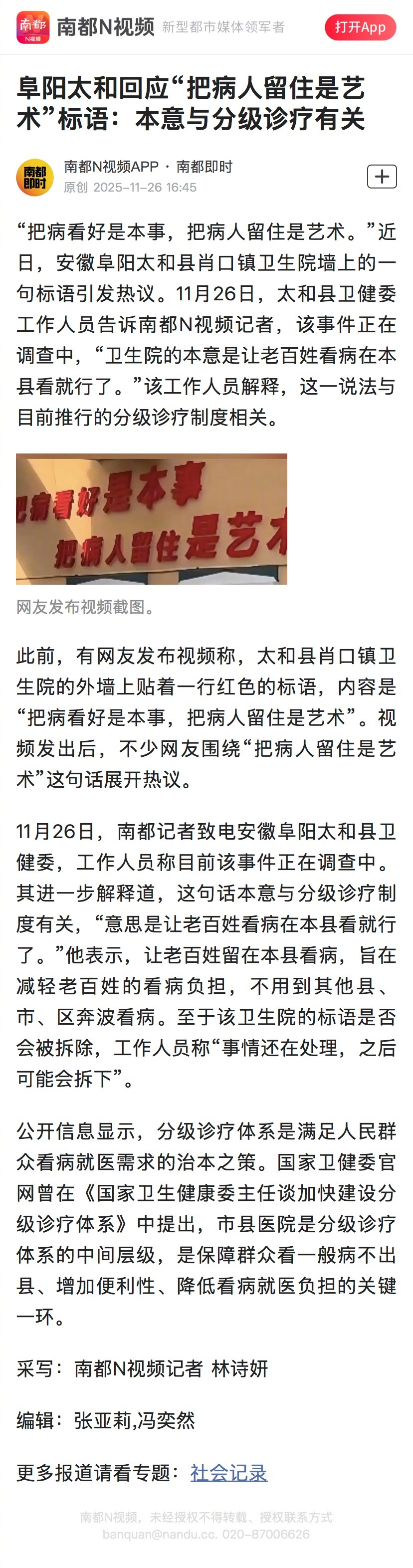 #当地回应把病人留住是艺术标语#【阜阳太和回应“把病人留住是艺术”标语:本意与分级诊疗有关】“把病看好是本事,把病人留住是艺术。”近日,安徽阜阳太和县肖口镇卫生院墙上的一句标语引发热议。11月26日,太和县卫健委工作人员告诉南都N视频记者,该事件正在调查中,“卫生院的本意是让老百姓看病在本县看就行了。”该工作人员解释,这一说法与目前推行的分级诊疗制度相关。南都N视频记者 林诗妍
