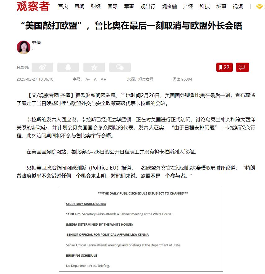 美国国务卿卢比奥拒绝了与欧盟外交负责人卡拉斯的双边会晤。   美国这波操作真是把