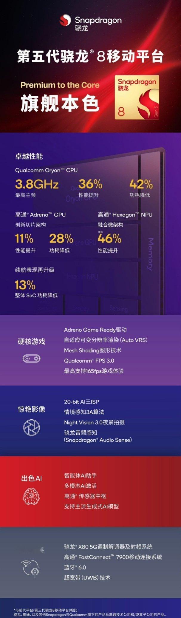 【骁龙8Gen5平台正式发布】该平台采用3nm制程工艺,配备第三代高通Ory