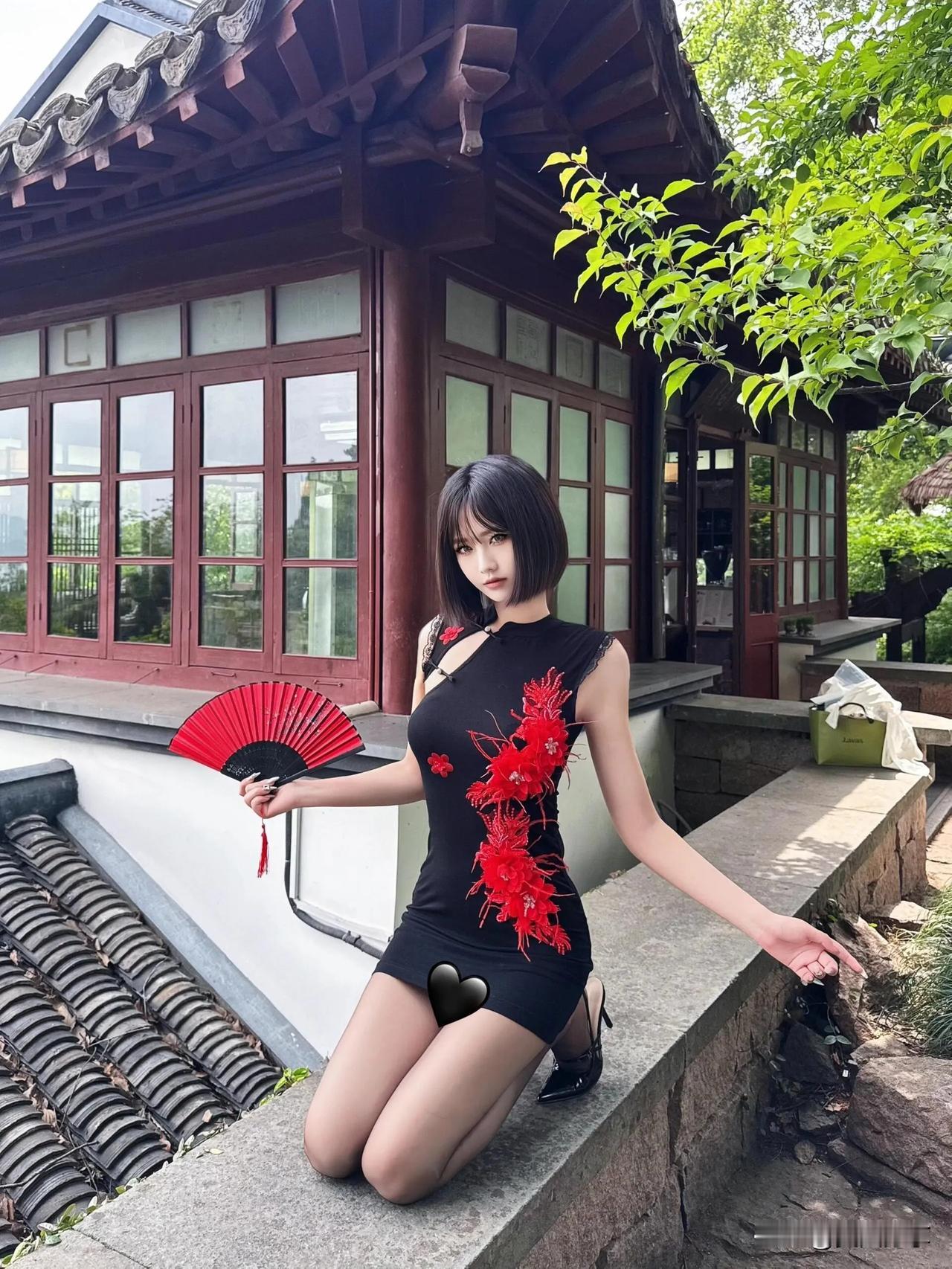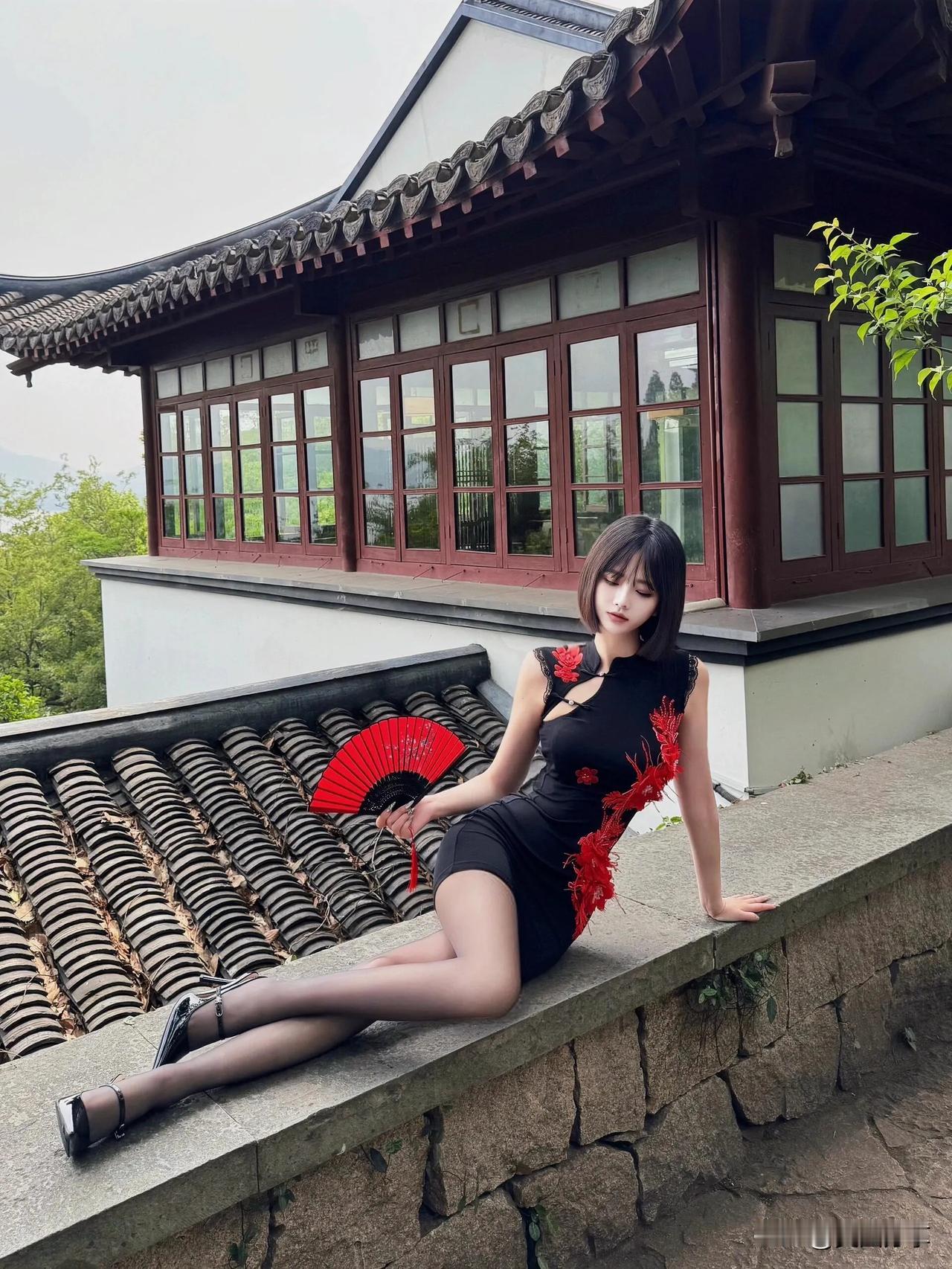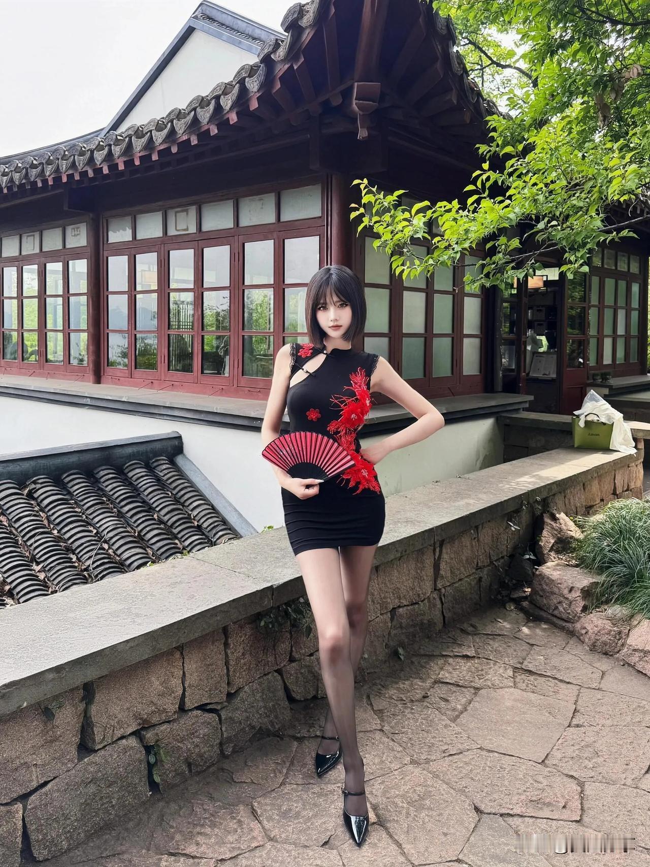 今日生活小记:遇性感旗袍女神,黑裙红花摇曳,古建前持扇而立,美态难忘[爱慕][爱