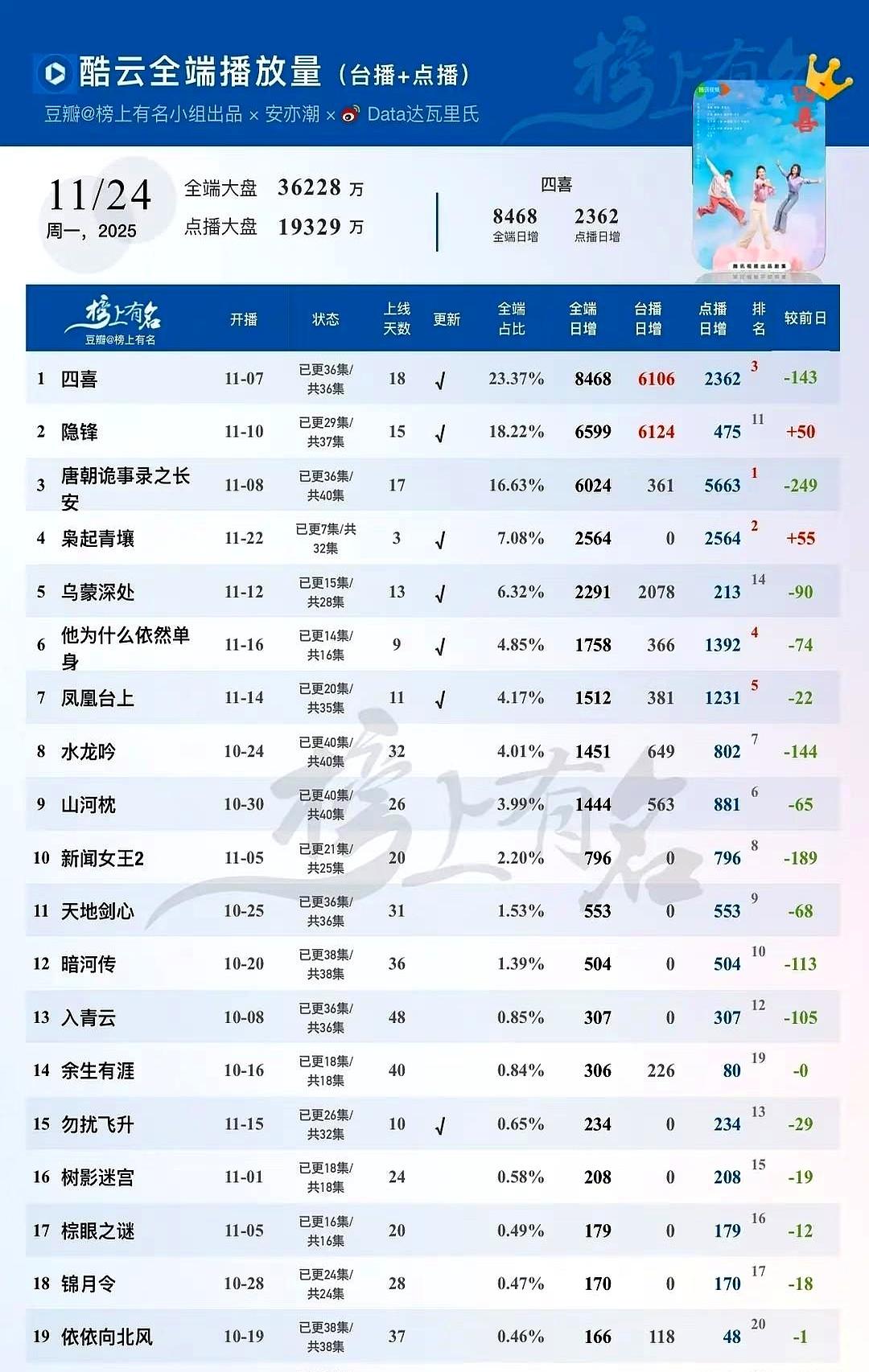 11.24剧集播放量TOP1:《四喜》单日狂揽8468万! 《四喜》开播1