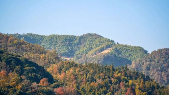 山峦的翠绿底色上,开始点缀起一簇簇、一团团明媚的色彩,像打翻的调色盘,又像冬日里温暖的炉火。