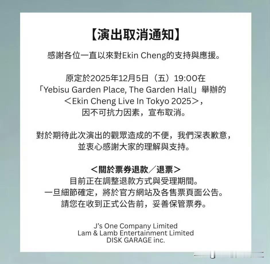 郑伊健原定12月5日的东京演唱会因不可抗力宣布取消 大概率是他的粉丝都是国内的,因为国内的人大部分不去了,所以这波韭菜也割不到了,只能取消