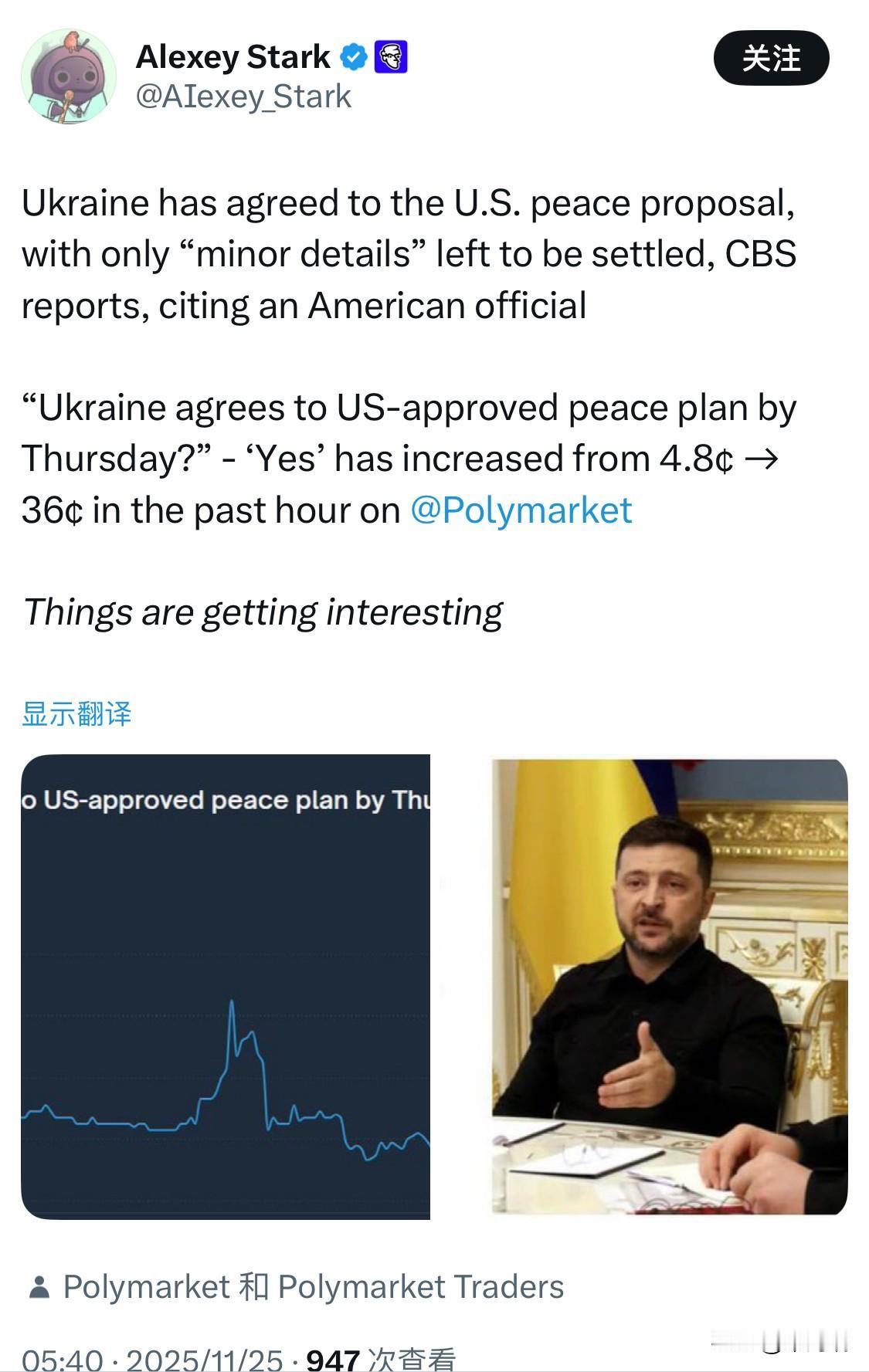 据哥伦比亚广播公司(CBS)援引一位美国官员的话报道,乌克兰已同意美国的和平提议,只剩下“一些小细节”需要敲定。 “乌克兰是否会在周四之前同意美国批准的和平计划?”——“是”的赔率在过去一小时内从 4.8¢ →上涨至 36¢ 事情变得越来越有趣了。