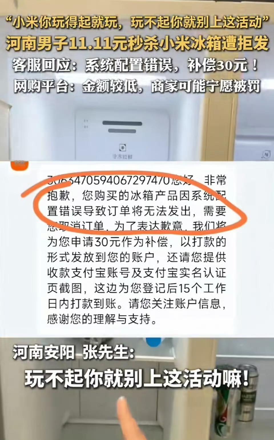 一位用户说自己参与了小米举办的活动并且中了一台冰箱,但最后没有收到实物奖品,只拿到了30元补偿。这件事引起了不少网友的关注。 根据目前公开的信息,这位用户是在小米官方渠道参与互动后收到了中奖通知,奖品明确标注为某款小米冰箱。不过之后小米方面并没有直接发放冰箱,而是通过客服联系用户,提出用30元作为替代补偿。用户对此表示不满,并将经过发到了网上。 小米官方随后对此事作出了回应,解释称这次抽奖活动是由合作的第三方推广团队负责执行的。小米表示,按照活动规则,中奖者需要完成一定的兑换流程,比如提供收货信息等,但可能由于沟通或操作上的问题,导致奖品未能正常发放。他们承认第三方团队在处理过程中存在失误,用小额补偿代替实物奖品的方式确实不妥。 这件事也提醒大家,参加任何抽奖或优惠活动时,最好仔细阅读活动规则,保留好中奖凭证。如果遇到奖品未按约定发放的情况,可以先通过官方客服渠道沟通,必要时也可以向平台或消费者协会反馈情况。 事件源于:互联网料哥小米零嵌冰箱 二手小米冰箱 小米制冰冰箱 小米冰箱爆炸 小米冰箱维修 小米大容量冰箱 小米家电补贴