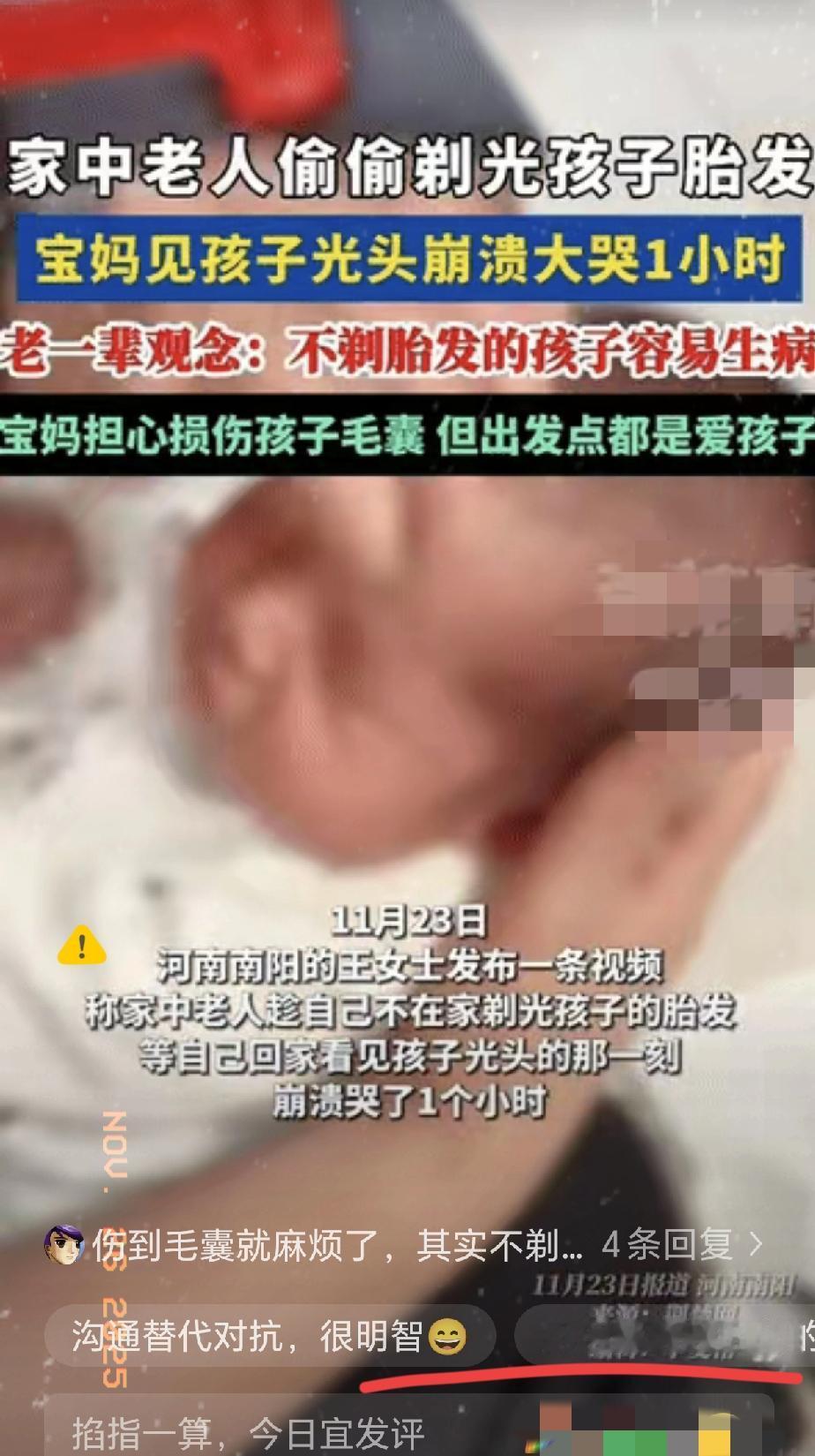 “防不胜防!”河南南阳,一宝妈因有事外出不到20分钟,回来发现家中奶奶趁着她不在家,偷偷将才几个月大的宝宝的胎发全部剃光了,宝妈回家看到孩子光头模样后,崩溃大哭近1小时! 这场育儿风波看着是“剃胎发”的小事,实则戳中了无数家庭的核心矛盾——不是爱与不爱的对立,而是两代人“爱的表达”与“科学认知”的错位。 老人信“剃胎发能让头发更浓密”的老传统,宝妈守着科学育儿的底线,藏起剃刀仍没拦住,本质是没打通沟通的桥。 王女士的通透在于没指责“好心办坏事”,丈夫用权威资料耐心科普,既给了老人尊重,又立下“不擅自做主”的规矩,这才是化解隔代育儿矛盾的关键。 隔代亲从不是负担,找对沟通方式,传统的爱和科学的养就能双向奔赴。你家遇到过类似的育儿分歧吗?是怎么化解的?来评论区聊聊~