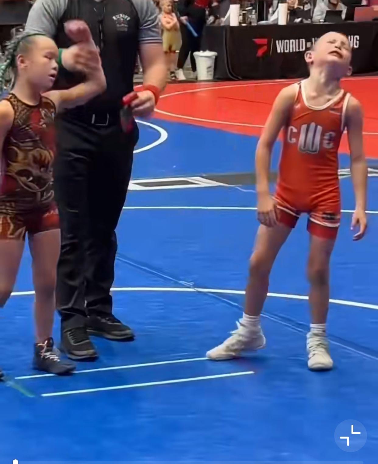 未来可期! 美国摔跤大赛决赛的比赛现场 一名6岁的华人小女孩思华,用自己的实力,把她的小男孩对手摔的嚎啕大哭,第一回合还有来有回,势均力敌!第二回完全被小女孩碾压,毫无还手之力,最终小女孩思华获得了比赛的最终胜利! 网友说这个年龄段女孩不吃亏,等再大一点就摔不过男子了….但不管怎么说,小女孩厉害,一路过关斩将,取得了最后的胜利![赞]