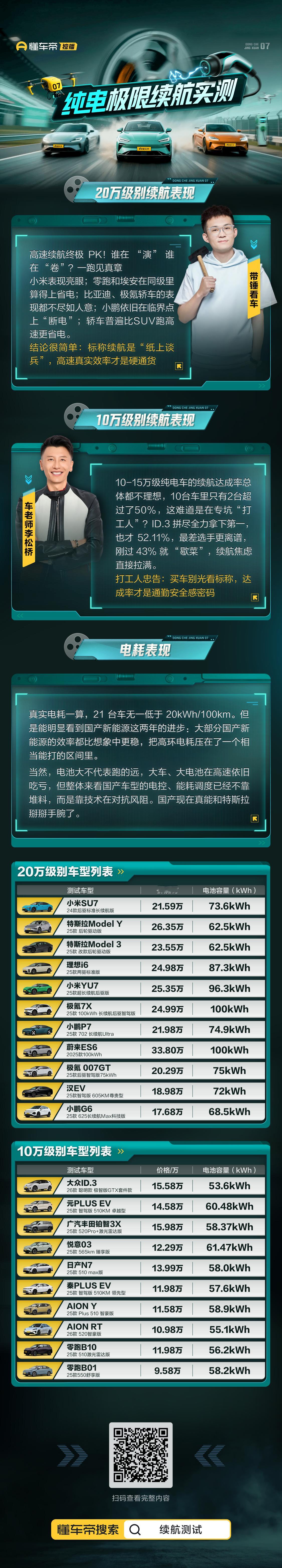 当把21台热门纯电车集齐,进行“满载”“高速”“120km/h不减速”极限续航测试,结果…小米表现还算亮眼,多数表现都不尽人意,小鹏更是在临界点上动力消失。续航达成率超过50%的只有8款车,10-15万级别只有2款车达标,实话说官标续航只是“纸上谈兵”,高速真实效率才是硬通货。大v聊车新能源汽车