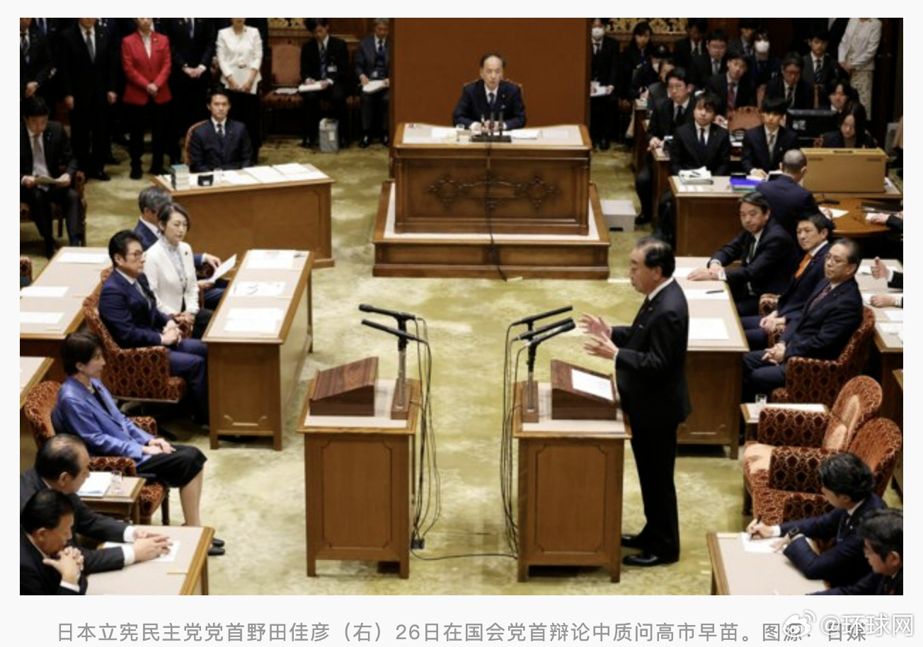#日本前首相当面质问高市早苗#【野田佳彦质问高市早苗:对于日中关系恶化,你认为自己应承担什么责任?】#高市被质问当前局面应承担的责任# 日本首相高市早苗近期在国会发表涉台错误言论引发多方强烈批评。据日本雅虎新闻网等媒体报道,针对高市的错误言论,立宪民主党党首、日本前首相野田佳彦26日在国会党首辩论中质问:对于日中关系恶化,你认为自己应承担什么责任?日媒称,关于日中关系,野田佳彦表示:“虽然日美同盟是我国外交与安全保障的基石,但中日关系同样重要,即便再过100年,两国仍是邻国这个事实也不会改变,构建互利共赢的双边关系至关重要。”野田佳彦表示,自11月7日高市在日本国会答辩时称“台湾有事”或构成日本可行使集体自卫权的“存亡危机事态”后,“遗憾的是,(中日)关系陷入了冷淡”。野田佳彦进一步说:“关于台湾问题,我们应遵循模糊策略……而日本单独明确立场只会损害国家利益,这难道不是独断专行吗?对于因此导致的中日关系恶化,你认为自身应承担什么责任?”报道称,面对野田佳彦的追问,高市早苗并未作正面回应。对此,野田佳彦再次表示,“我问的是,首相对于她的发言所引发当前的局面应承担什么责任?”本月7日,高市在日本国会答辩时称,“台湾有事”或构成日本可行使集体自卫权的“存亡危机事态”。此番言论随即引发法律学者、反战组织及在野党的强烈批评。日本前首相石破茂、野田佳彦和鸠山由纪夫日前分别就现任首相高市早苗在国会发表涉台错误言论引发的日中关系紧张提出批评,呼吁其谨言慎行,通过对话推动关系改善。