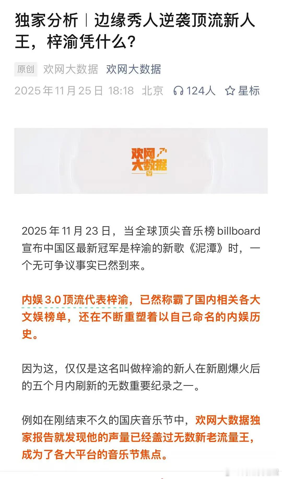 含金量很高的欢网专门出了一篇分析梓渝的文3.0时代只冲出了梓渝一位顶流,和其他顶流模式不同,他既没有家世背景,也没有大IP资源傍身,且完全没有被资本押宝投注。内娱的造星模式在改变,zb捧不出大顶流的欢网认证梓渝是三代顶流