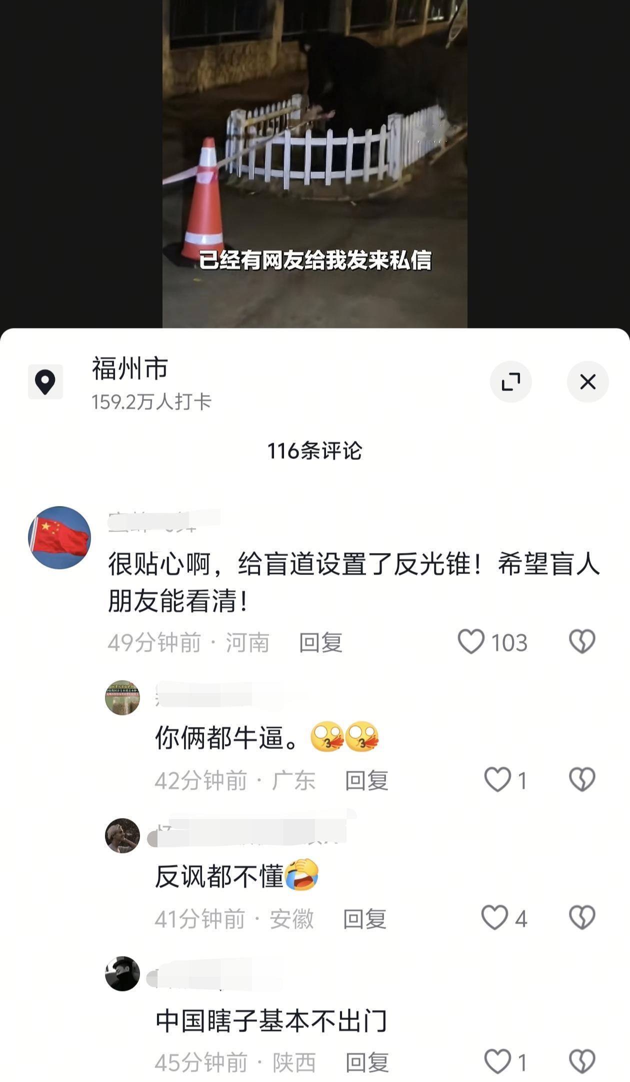 给盲道放反光锥? 评论区差点给我整笑了! 福建福州这事儿太魔幻了!男子下班后发现盲道旁刺绳下垂,130cm高、50cm探路宽,暗藏刮伤风险,拍抖音曝光后仅2小时就收到整改消息,第二天路过已摆好反光锥、拉上警戒带,效率直接拉满! 评论区一条讽刺被网友点赞:“给盲道放反光锥,希望盲人朋友能看清!” 不得不说这反讽太精准,但笑着笑着又觉得暖心——整改的初衷藏着对路人安全的牵挂,只是没完全适配盲人朋友的需求,算是个“善意的小疏忽”。 其实快速响应已经是城市温度的体现,而网友的幽默吐槽,更像是给整改提了个“精准优化”的小建议。相信后续会有更贴心的调整,比如加触觉警示条、修复刺绳,让特殊群体也能安心通行。 网友善意提建议,都是为了让城市变得更好!从发现问题到快速整改,再到琢磨更周全的方案,每一步都是对“安全无小事”的践行。为这份双向奔赴的责任心点赞,也期待未来的公共设施能越来越兼顾每一个人的需求。