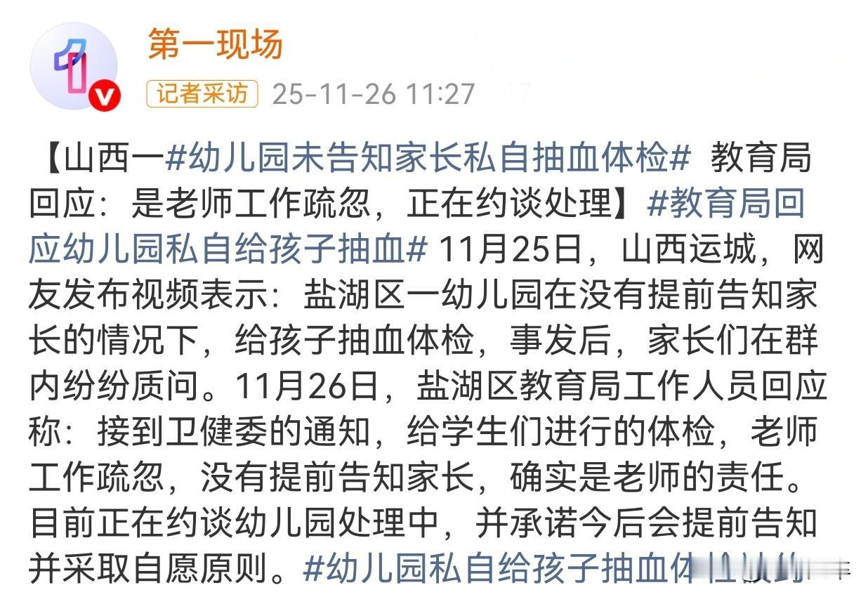 这也太吓人了! 11月25日,山西运城盐湖区某幼儿园在未提前通知家长的情况下,组织妇幼保健机构对幼儿进行静脉抽血(约8毫升)。家长通过孩子身上的针孔以及事后的群通知才知情,引发家长集体质问。次日教育局回应称,此为卫健委统一安排的常规体检(血常规等基础项目),但涉事班级教师因工作疏忽未履行告知义务,已约谈幼儿园并承诺今后执行[提前告知+自愿参与]原则。 让我们想一想,事件中抽取静脉血8ml(远超儿童血常规1-3ml需求),结合教师"保密"指令,加剧家长对幼儿生物信息泄露的担忧。谁知道这是不是一场有预谋的私自抽血? 事后却以[老师疏忽]搪塞家长。幼儿属无民事行为能力人,抽血等侵入性医疗操作依法需监护人书面同意。幼儿园未获授权已经侵犯家长监护权及儿童身体自主权。这件事哪儿是“疏忽”这是幼儿园把《未成年人保护法》里的“监护人知情权”当成了空气。幼儿园连“告知家长”都省了,还逼孩子“保密”,这哪是保护,是把孩子当成了牲口。 也有人认为根据我国《幼儿园工作规范》在园儿童每年需进行一次全面的健康检查。年度体检就包括血液检查,如血红蛋白检测。这项工作的完成情况,直接与幼儿园的评级、评优等核心利益挂钩。因此幼儿园为了确保全部幼儿都参与体检(确保每一名幼儿都做血检)采取了隐瞒家长的方式,来达标。 可是幼儿园的每一项涉及幼儿的举措,都应建立在充分尊重与透明沟通之上。必须要尊重家长的知情权、选择权。无论体检的规定多么硬性。告知并取得监护人同意这个步骤都不可省略。儿童验血
