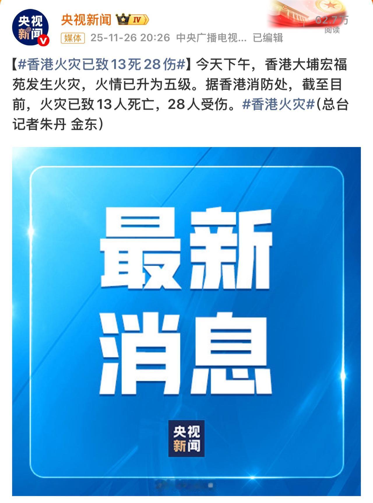 香港火灾已致13死28伤! 刚刚央视新闻发布了香港火灾的最新消息。 香港大埔宏福苑的火灾已是五级。 不忍心再看画面,只希望能抓紧控制火情,不要再增加伤亡人员了。 这的是多少家庭瞬间烧没了啊!心痛死了。